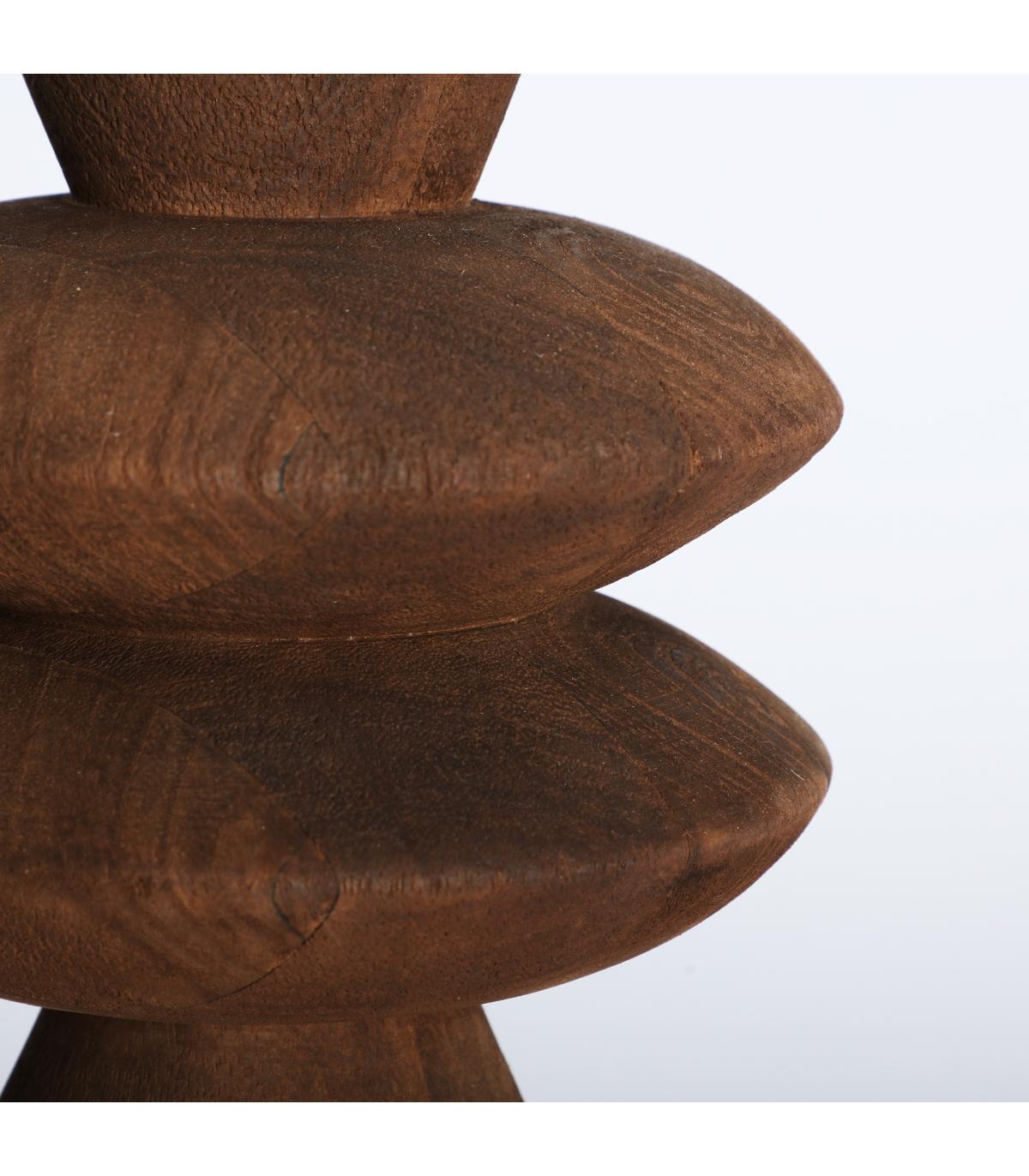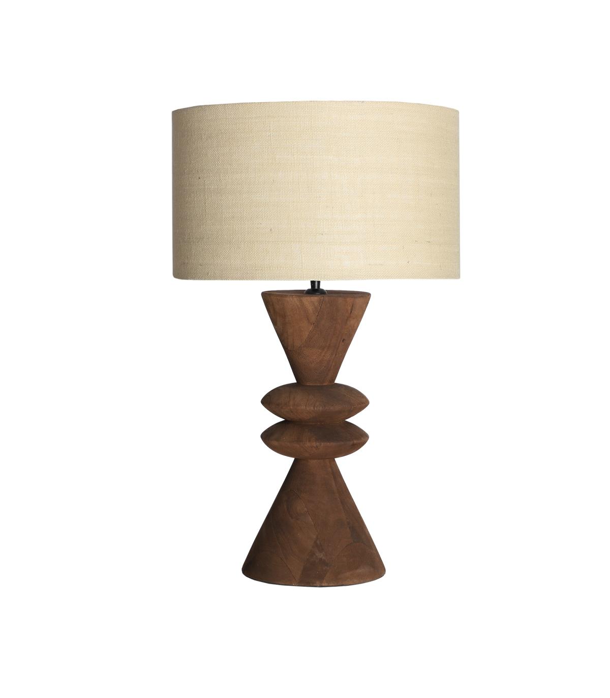 Lámpara de sobremesa Shama de estilo contemporáneo, fabricado en madera de mango en color marrón, combinado con lino en color beige. Producto desmontable.