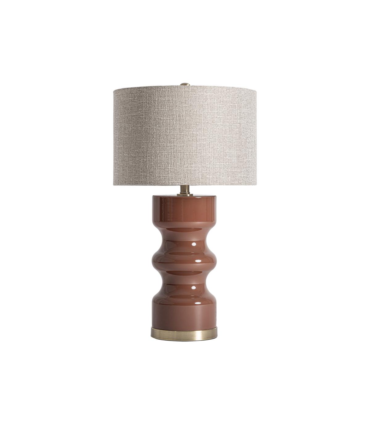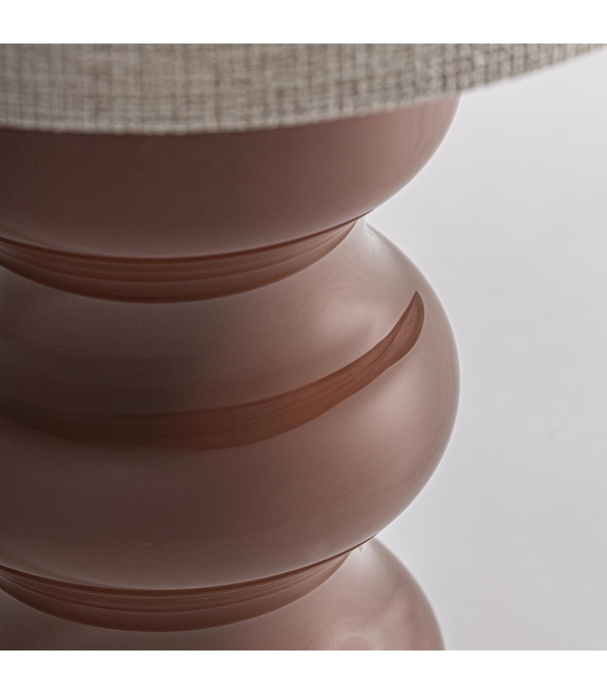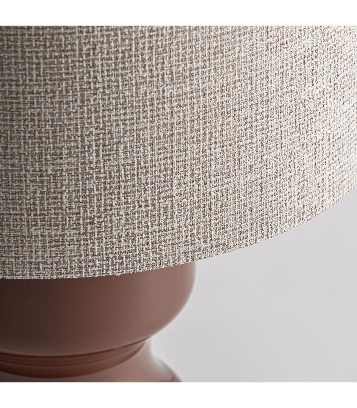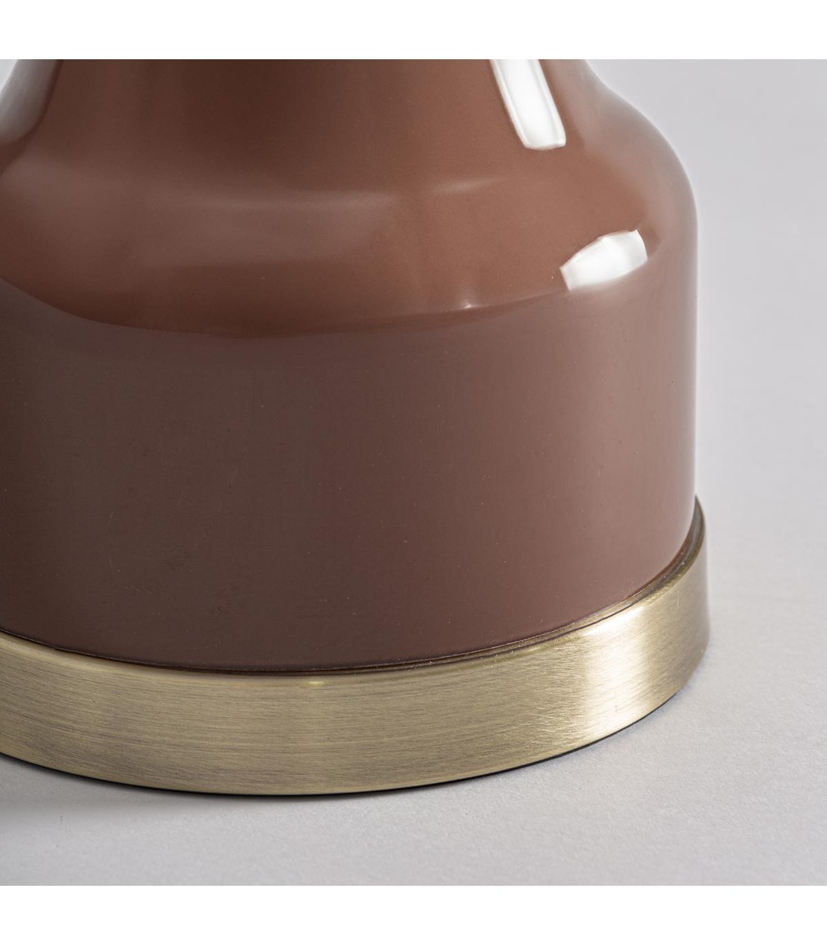 Lámpara de sobremesa Zalie de estilo contemporáneo fabricado en vidrio en color marrón combinado con hierro en color oro y lino en color beige. Producto desmontable.