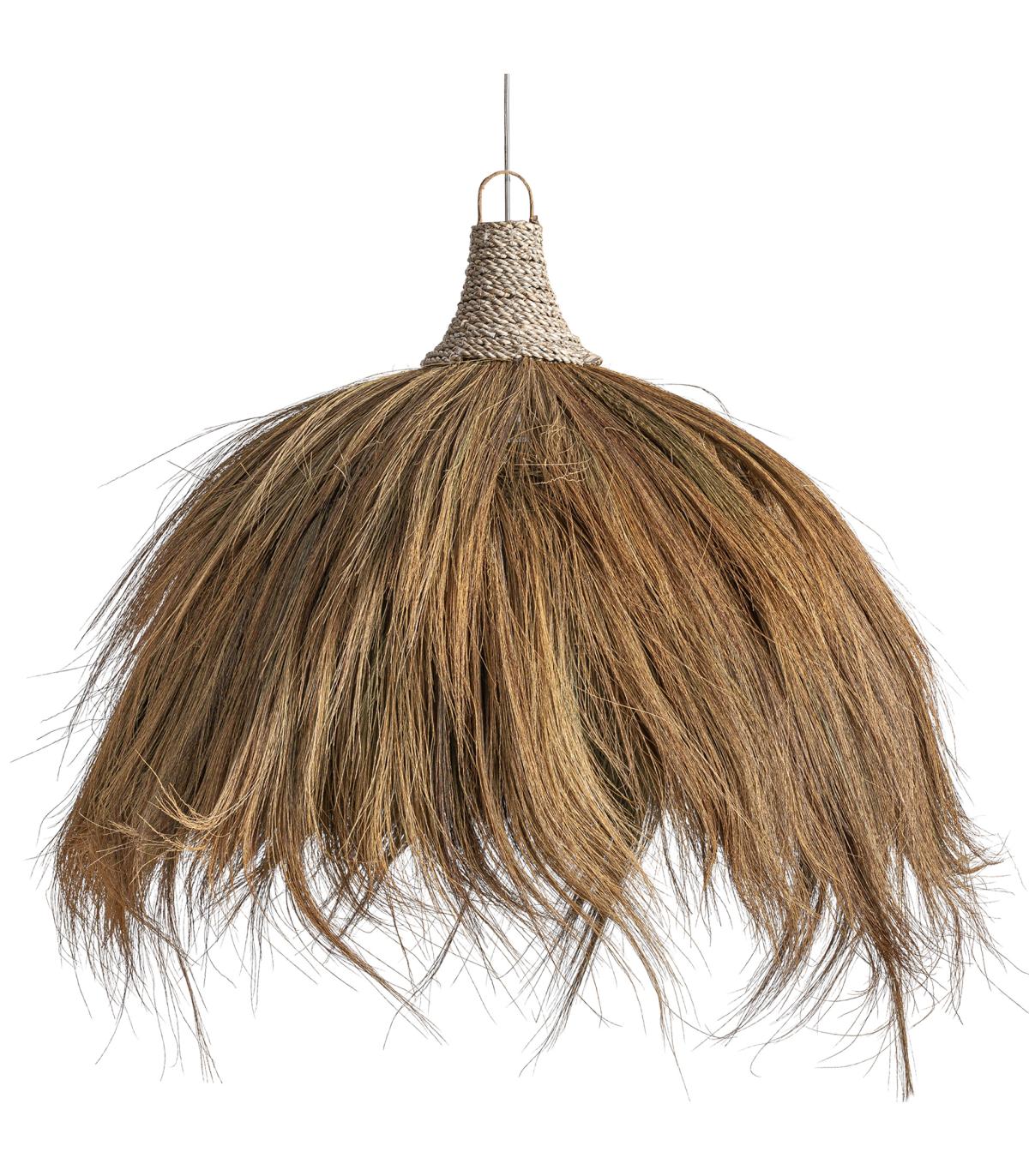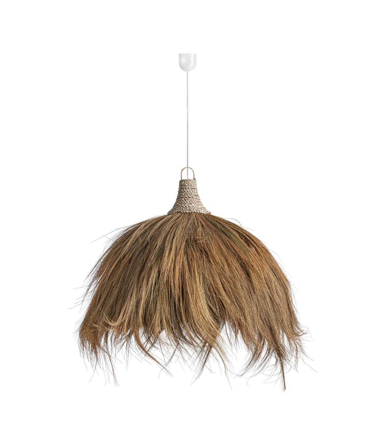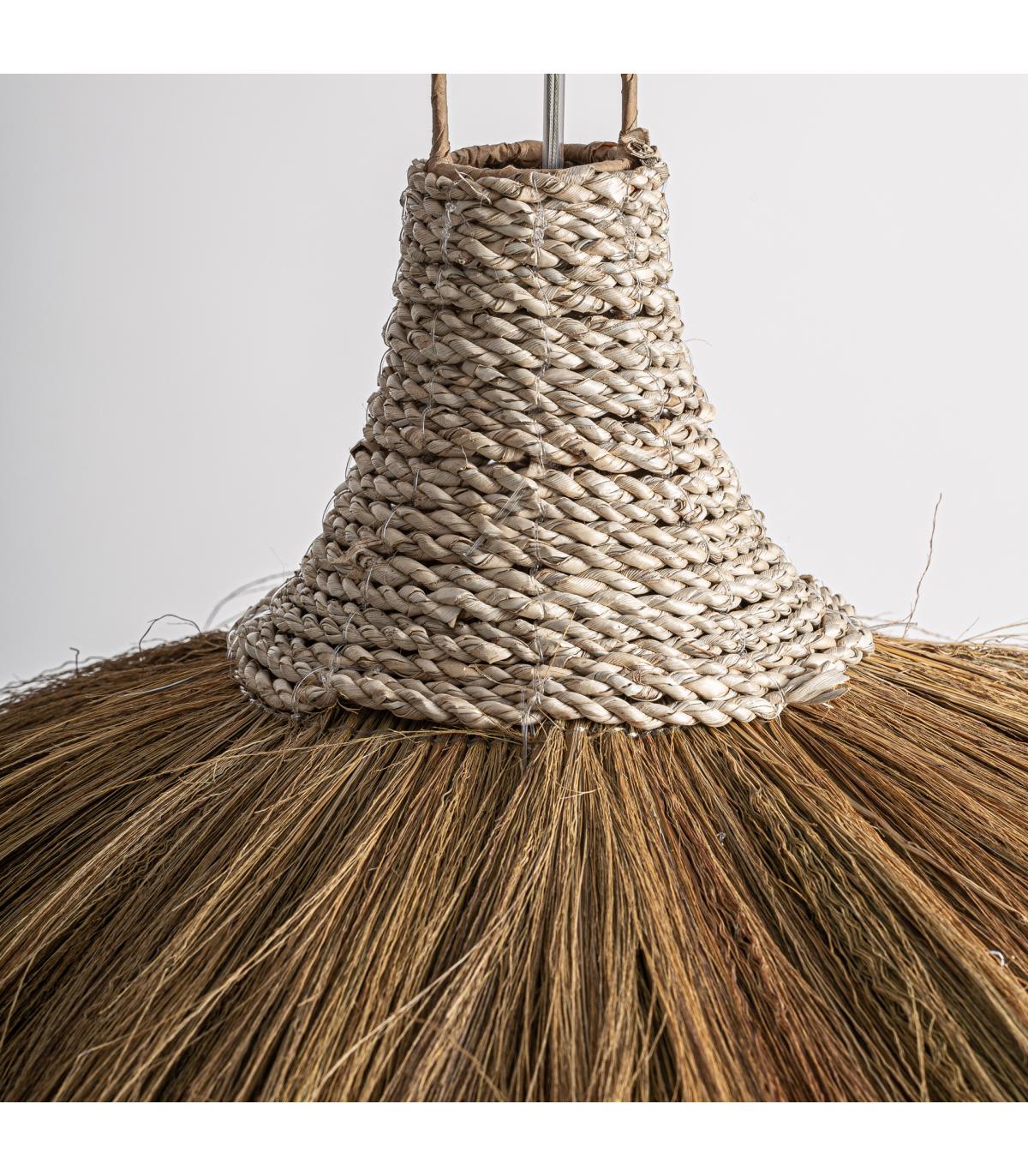Lámpara de colgar fabricado en fibra natural en color marrón.