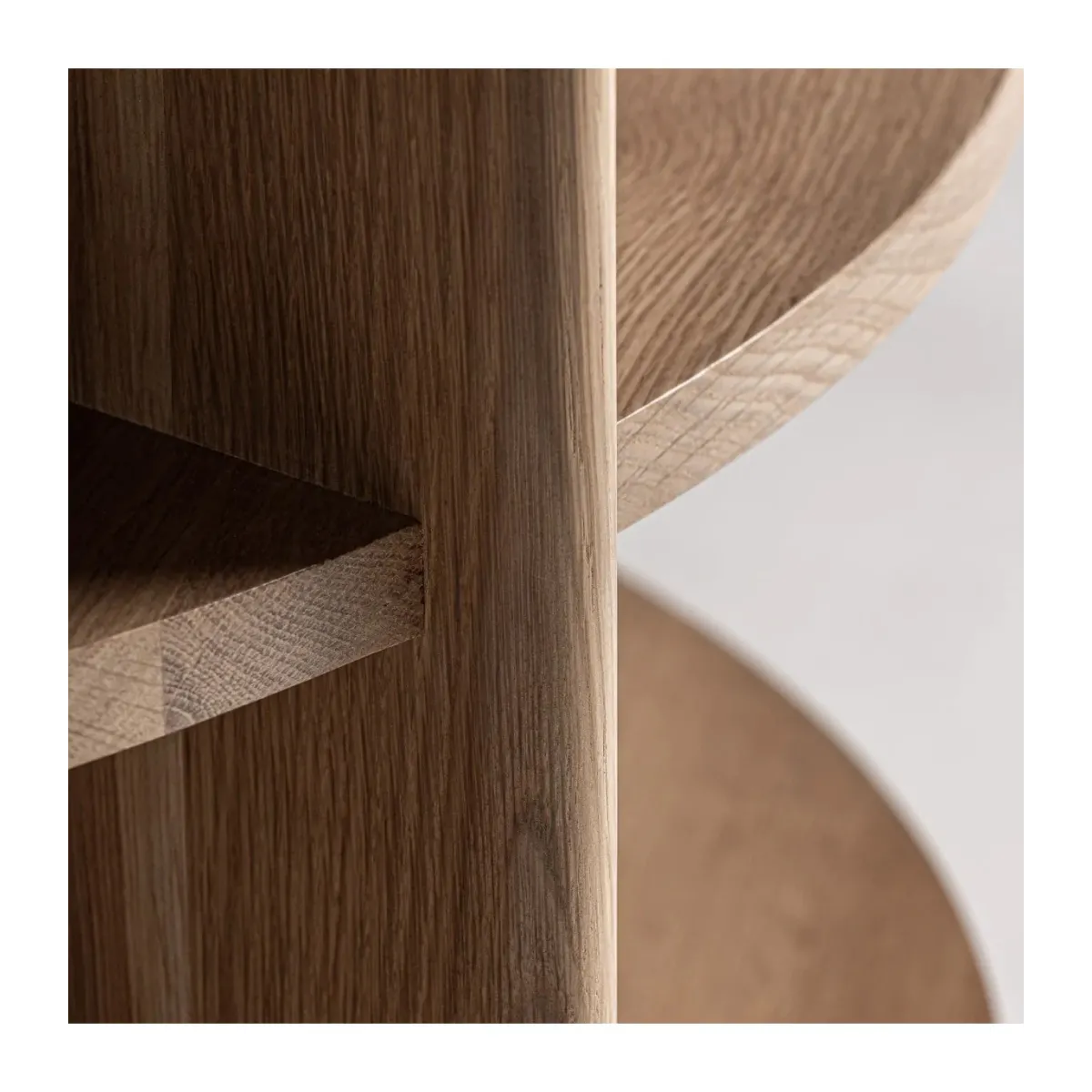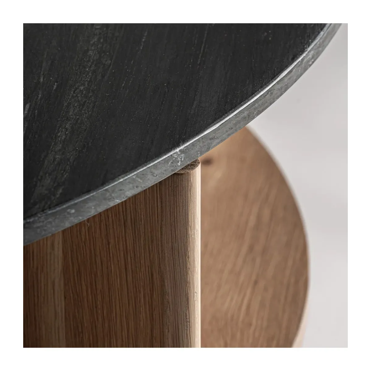 Mesa auxiliar nara de estilo contemporáneo fabricado en madera roble en color beige combinado con travertino en color marrón. Producto desmontable.