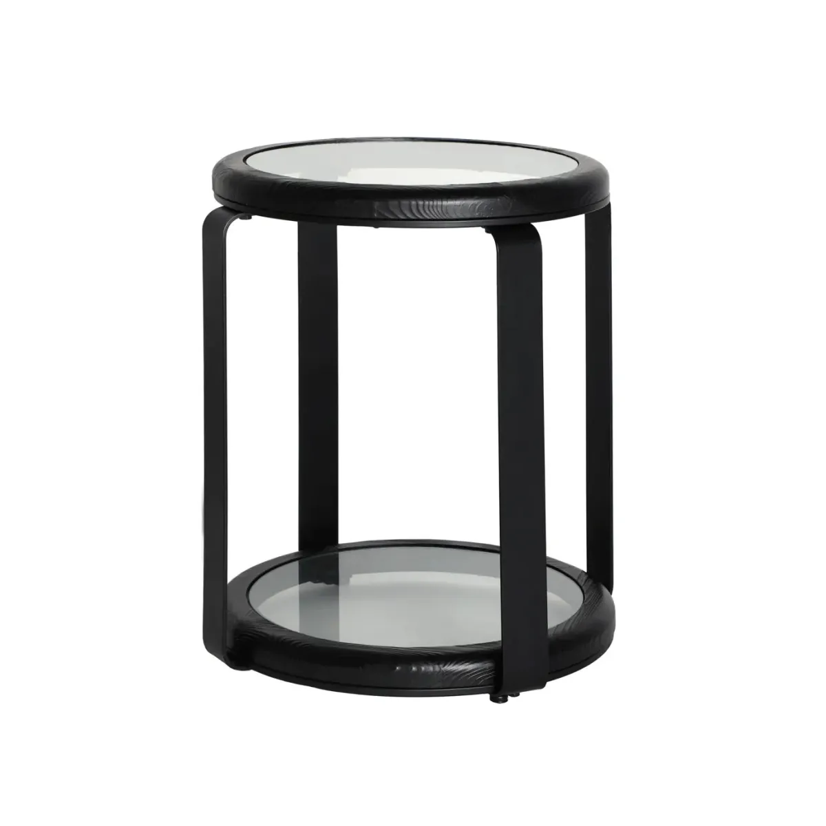 Mesa auxiliar Kilde de estilo minimalista, fabricado en madera de abeto en color negro, combinado con cristal en color transparente con acabado templado y hierro en color negro.