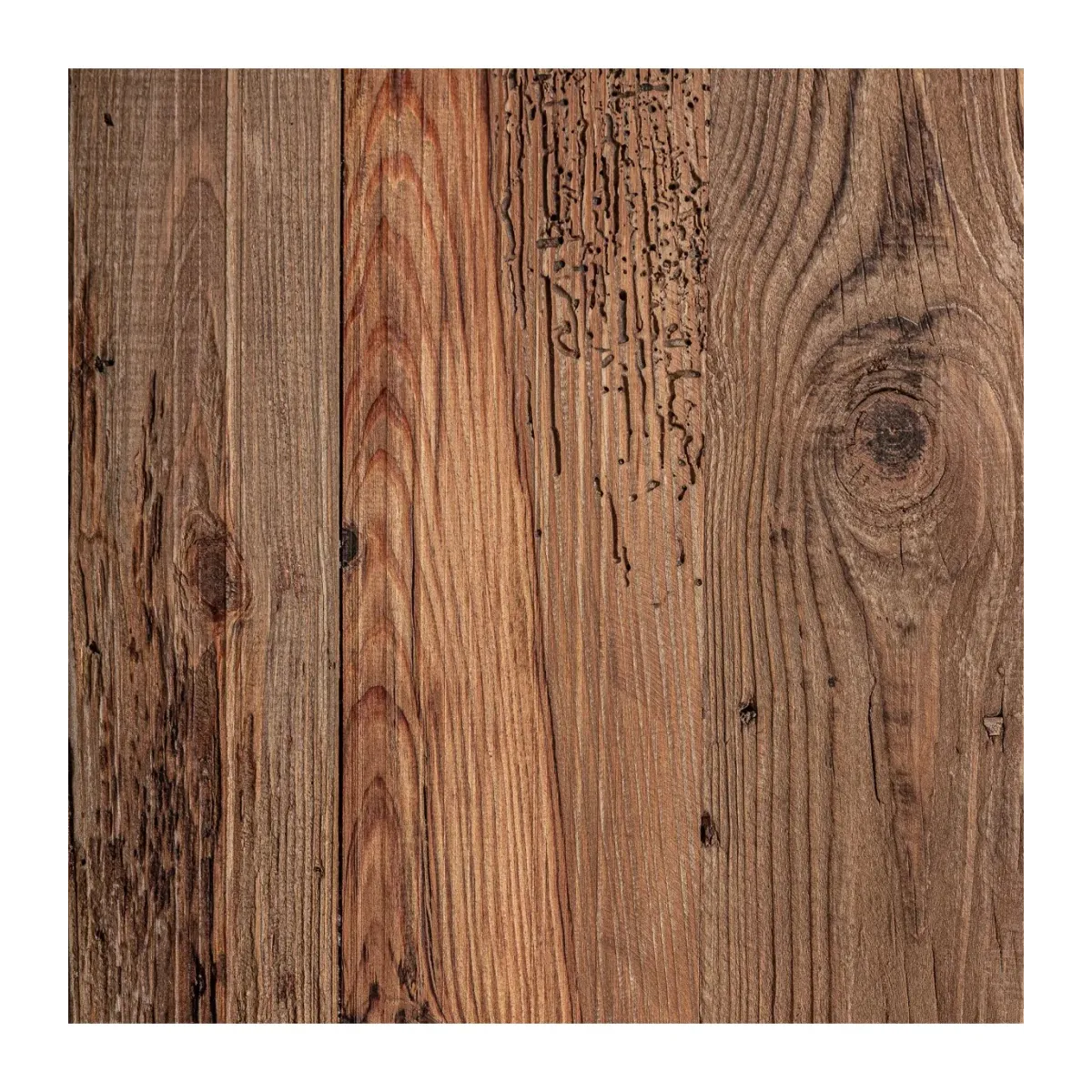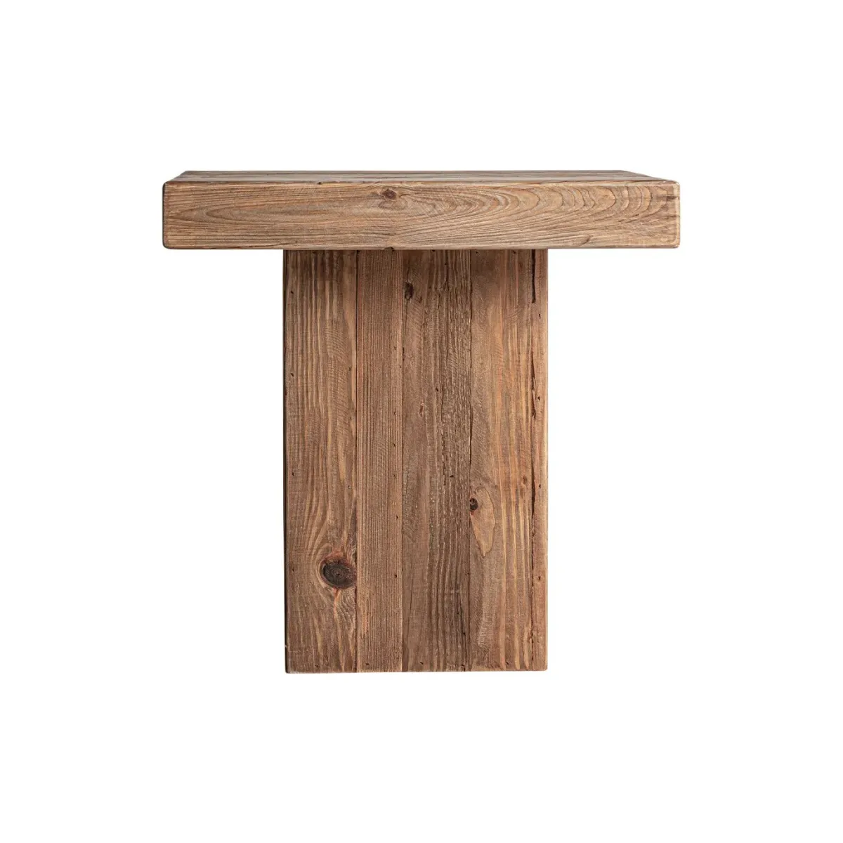 Mesa auxiliar breive de estilo rústico fabricado en madera de pino reciclado en color marrón con acabado envejecido.