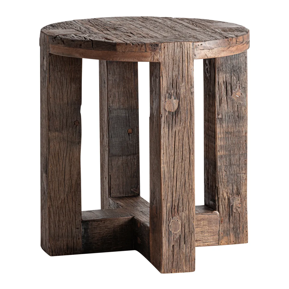 Mesa auxiliar fabricado en madera recuperada en color marrón.