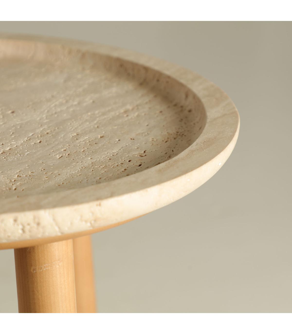 Mesa auxiliar redonda videix de estilo art deco, fabricado en madera abedul en color marrón, combinado con mármol en color beige. Producto desmontable.