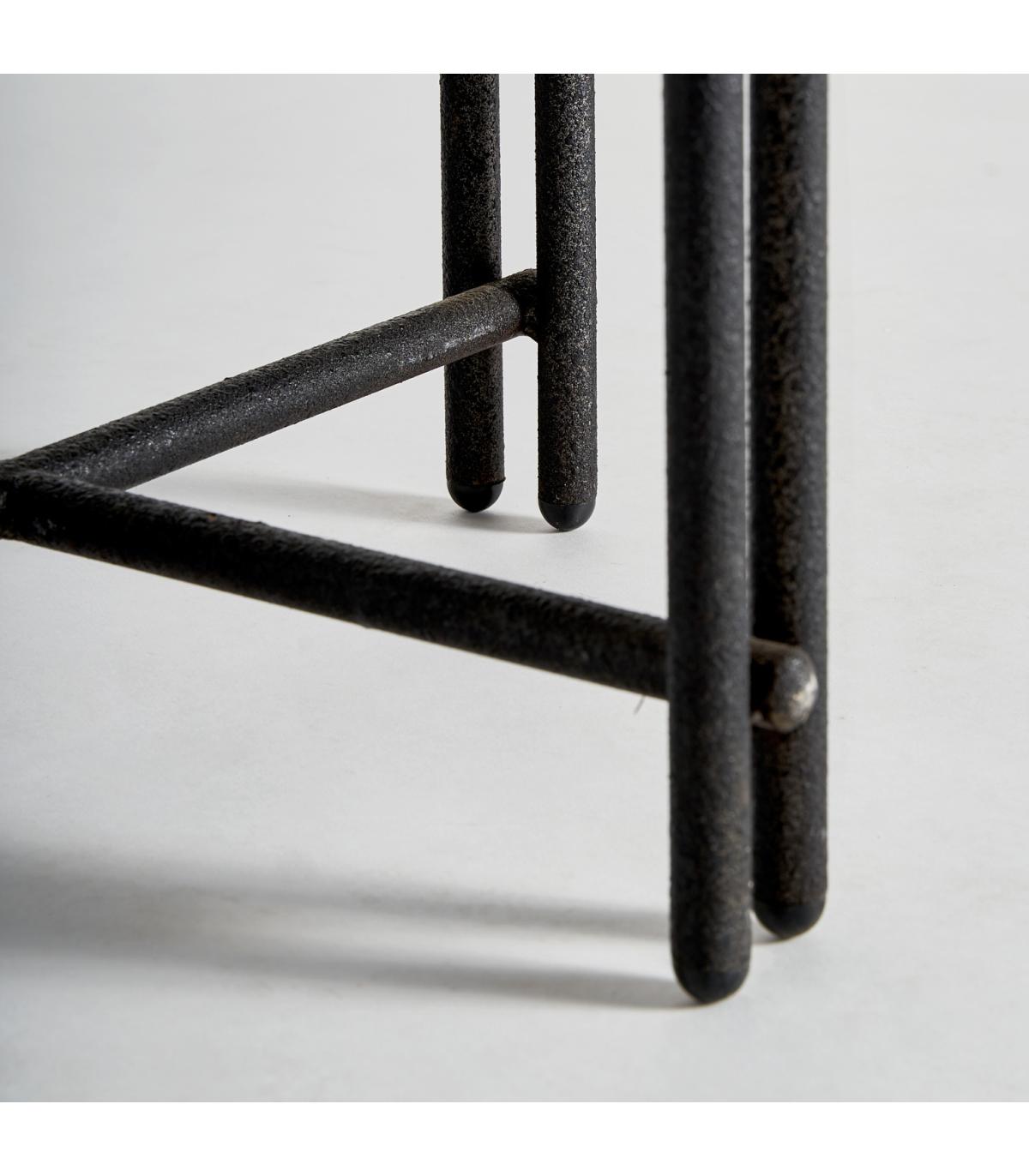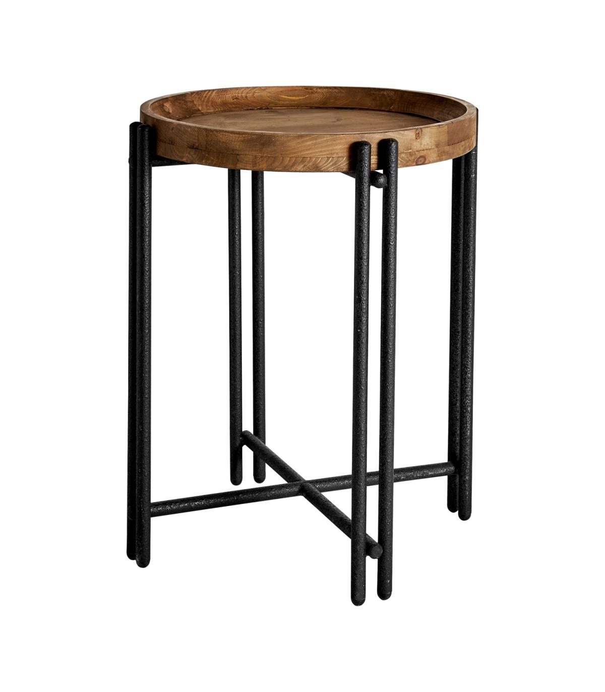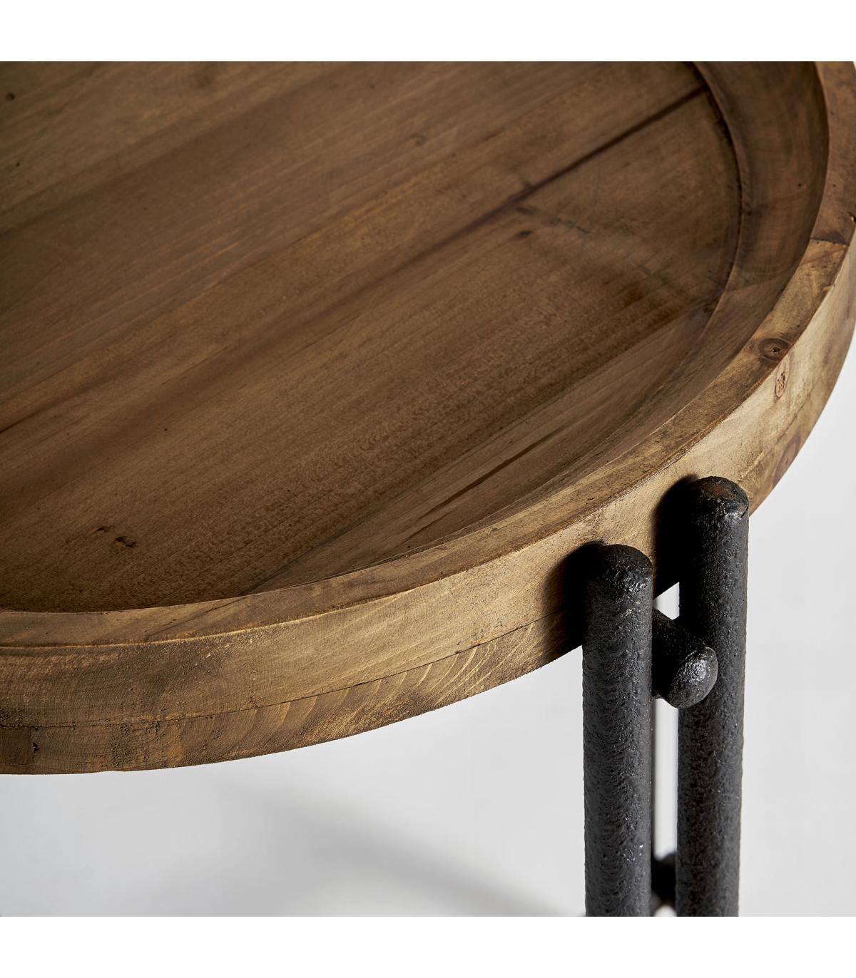 Mesa auxiliar minot de estilo industrial fabricado en madera de olmo en color marrón con acabado envejecido.