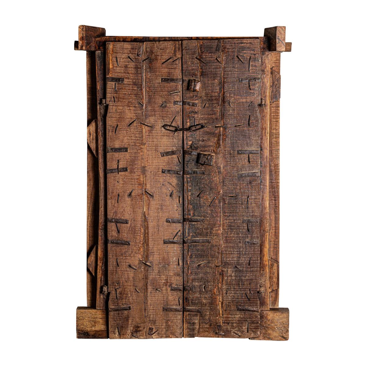 Puerta peigie de estilo étnico fabricado en madera de teka en color marrón con acabado envejecido.