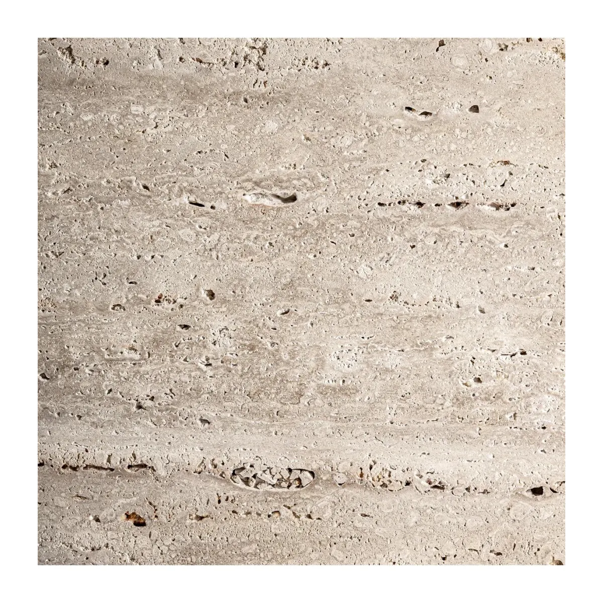 Mesa de centro de estilo art deco fabricado en travertino en color beige.