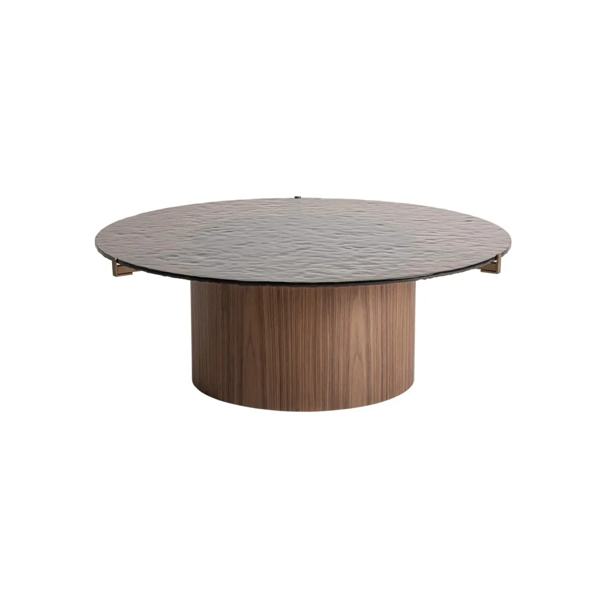 Mesa de centro giswil de estilo art deco fabricado en madera contrachapada en color marrón combinado con cristal en color ambar con acabado texturizado. Producto desmontable.