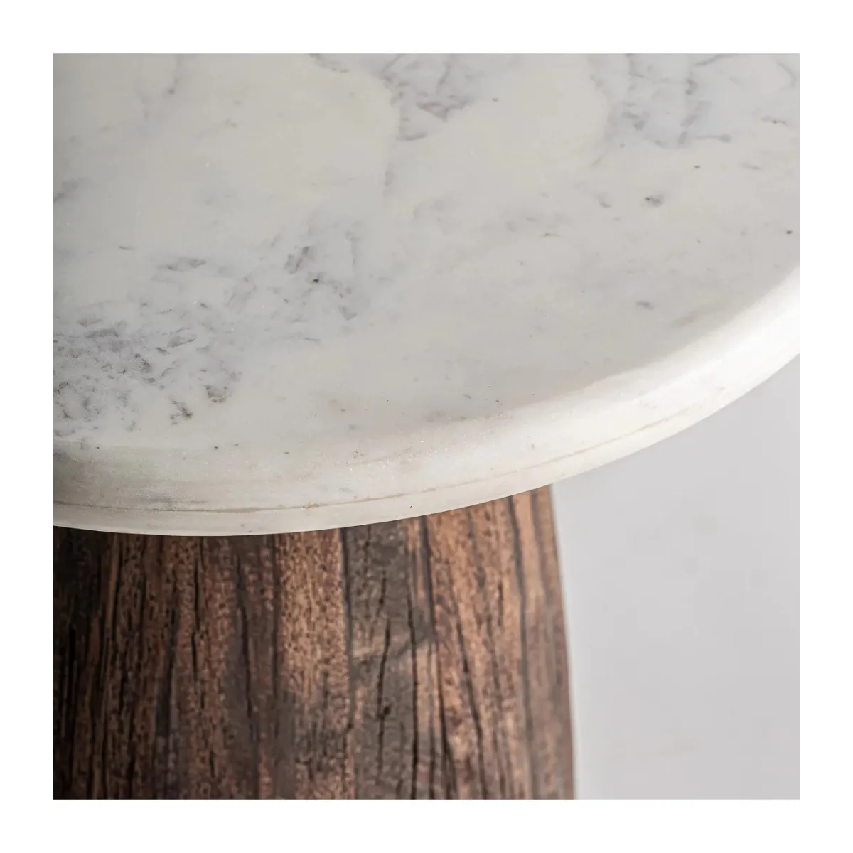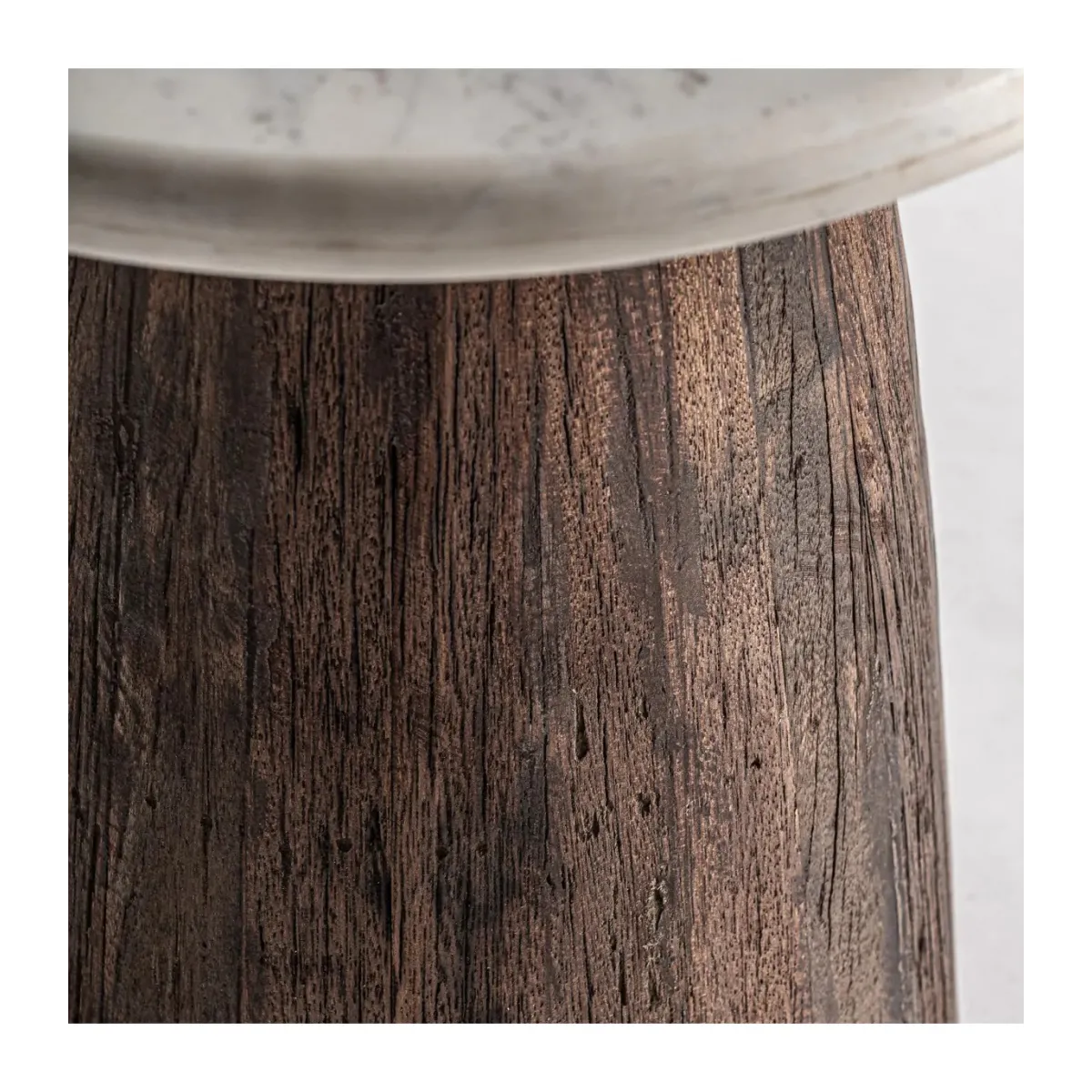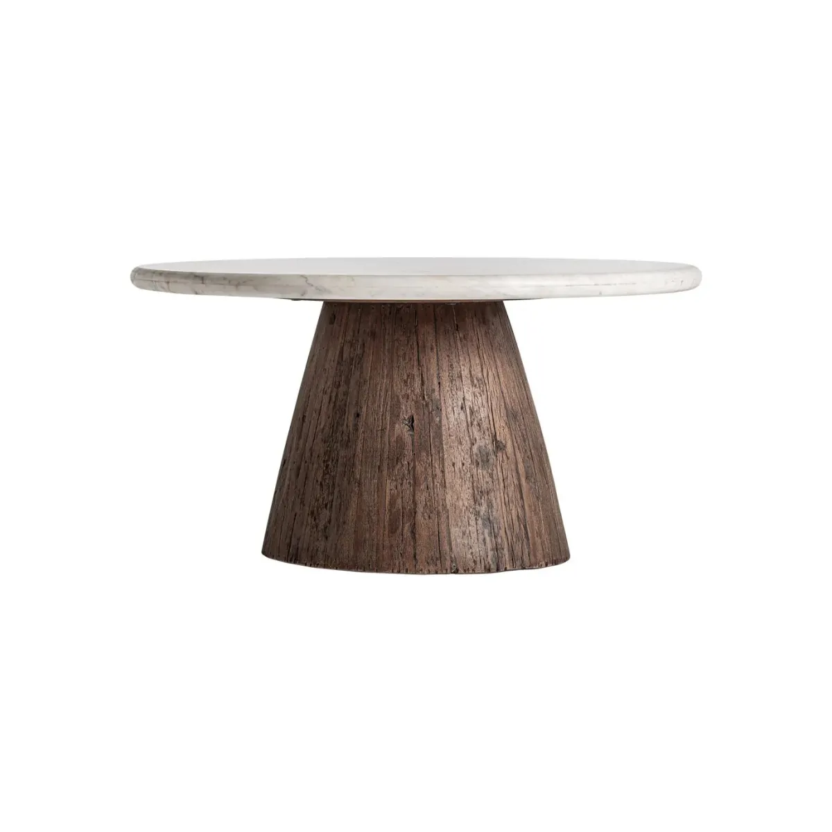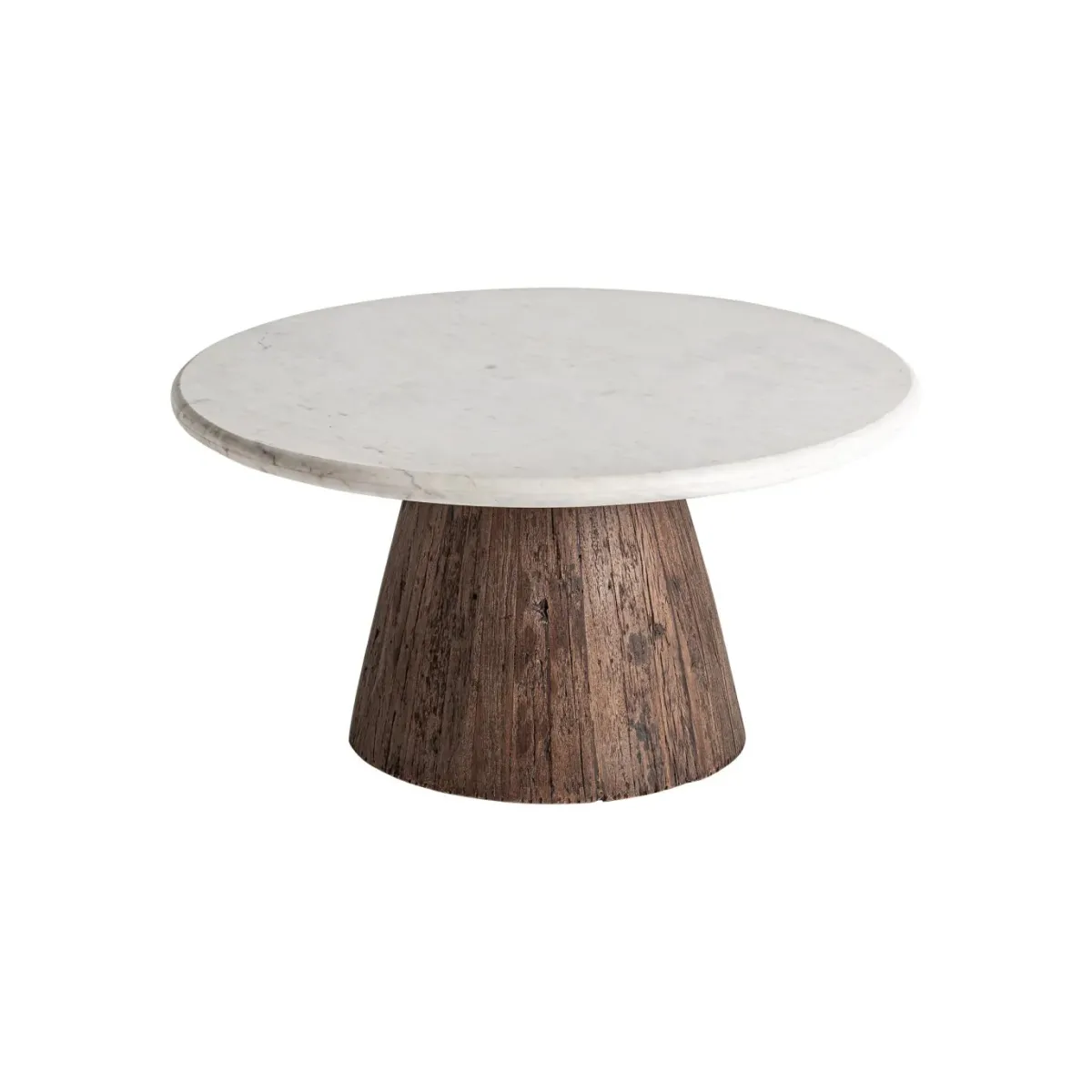 Mesa de centro skorup de estilo rústico fabricado en madera recuperada en color marrón con acabado envejecido combinado con mármol en color blanco.