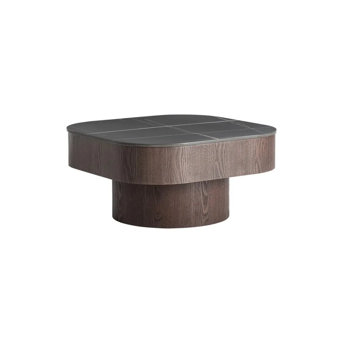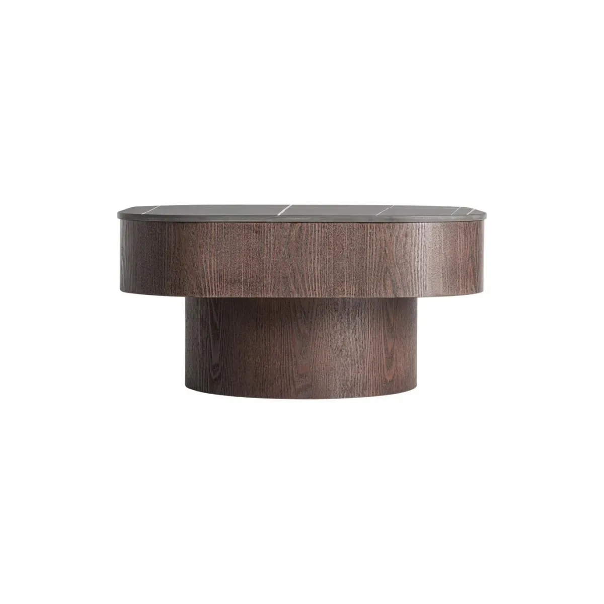 Mesa de centro Neufs de estilo contemporáneo fabricado en mármol sintético en color negro combinado con madera contrachapada en color marrón y chapa de nogal.