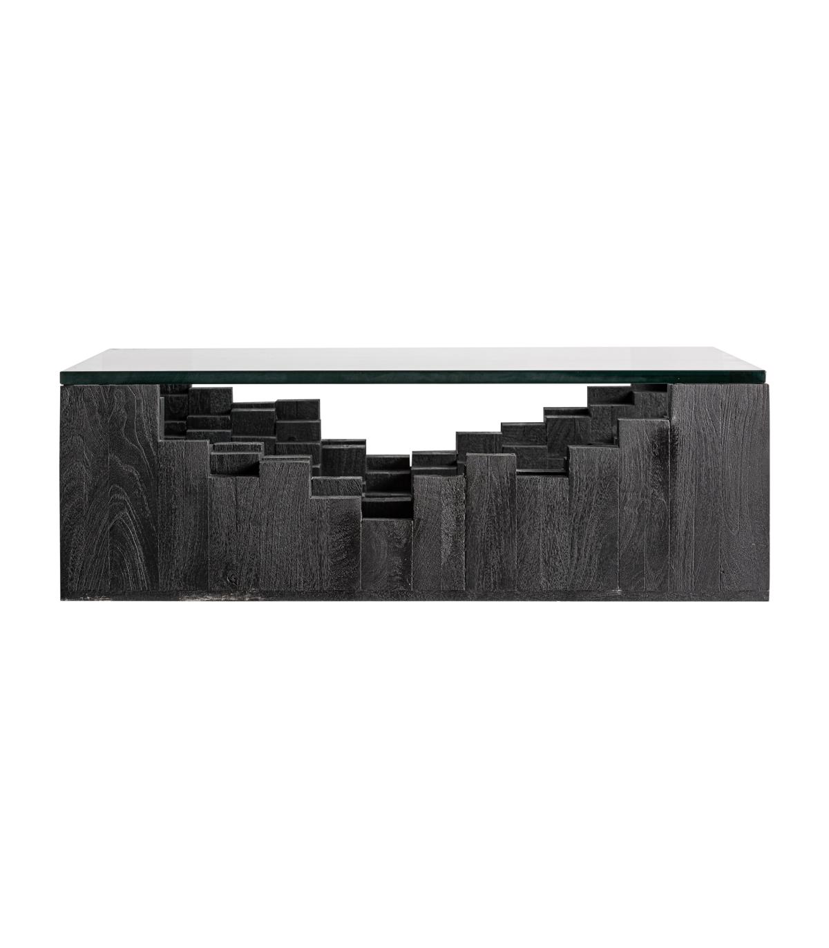 Mesa de centro Pètria de estilo contemporáneo fabricado en madera de mango en color negro con acabado arenado combinado con cristal en color tonos oscuros con acabado templado. Producto desmontable.