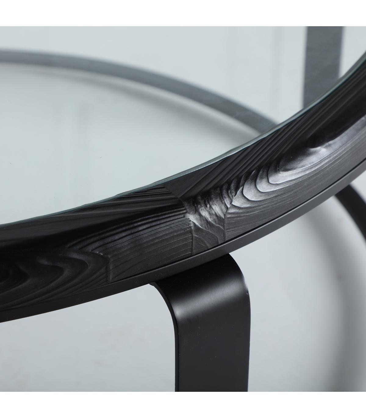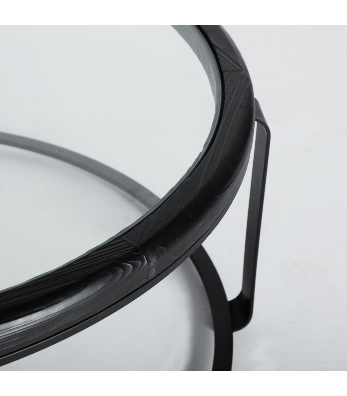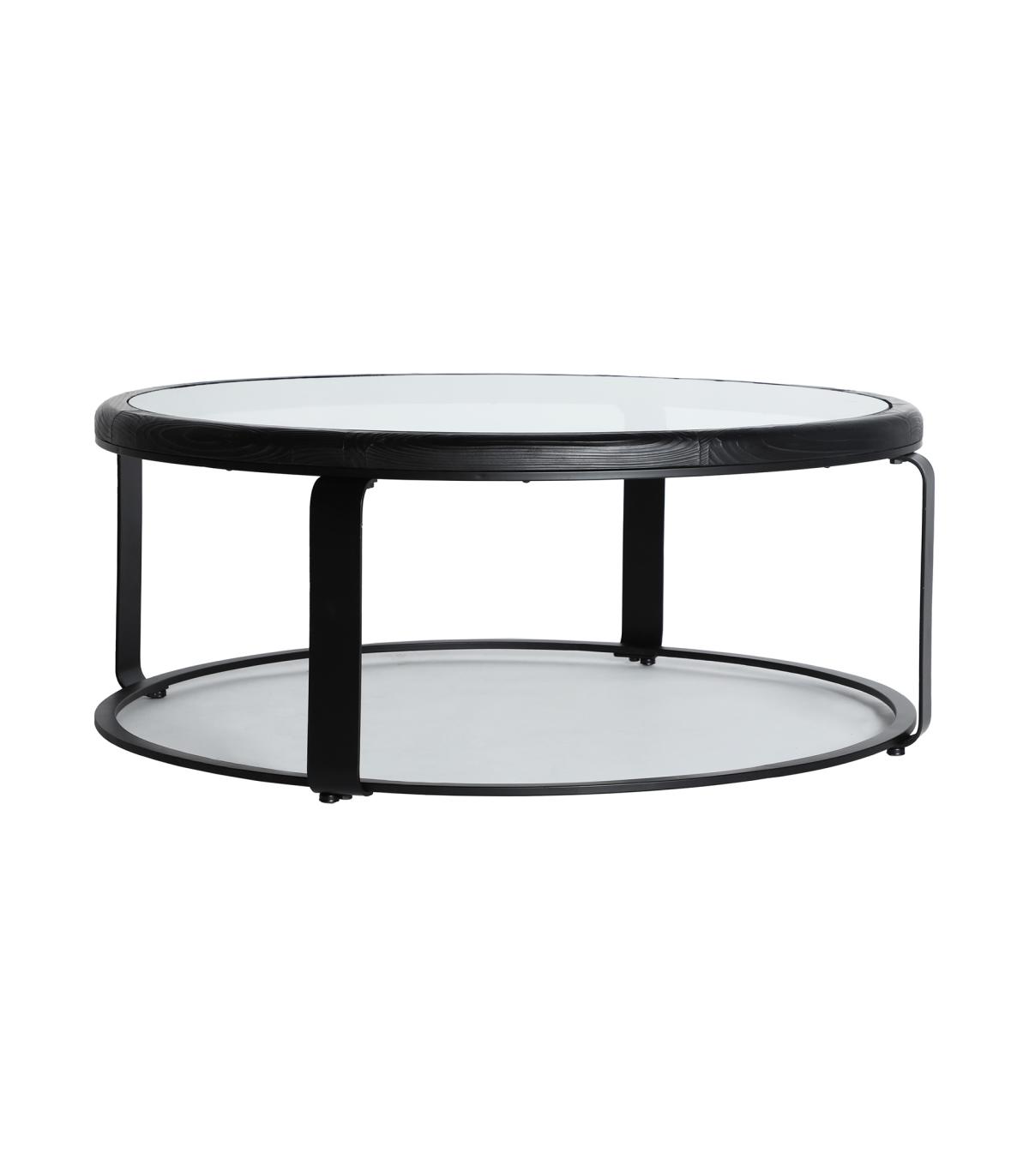 Mesa de centro Kilde de estilo minimalista, fabricado en madera de abeto en color negro, combinado con cristal en color transparente con acabado templado y hierro en color negro.