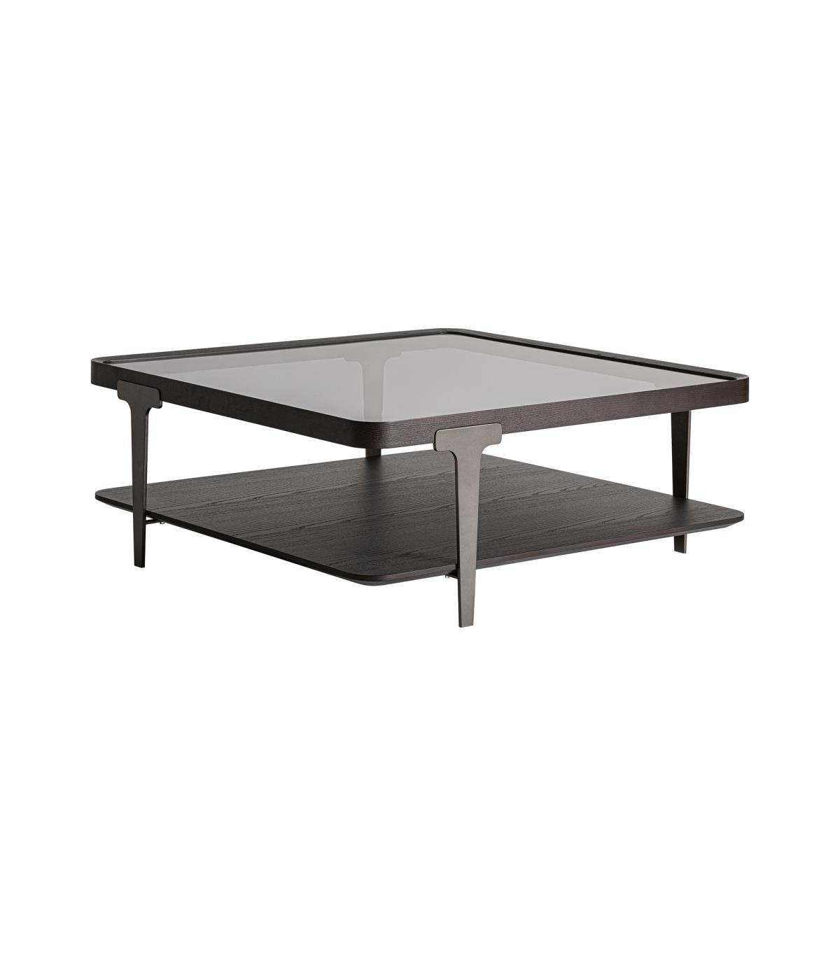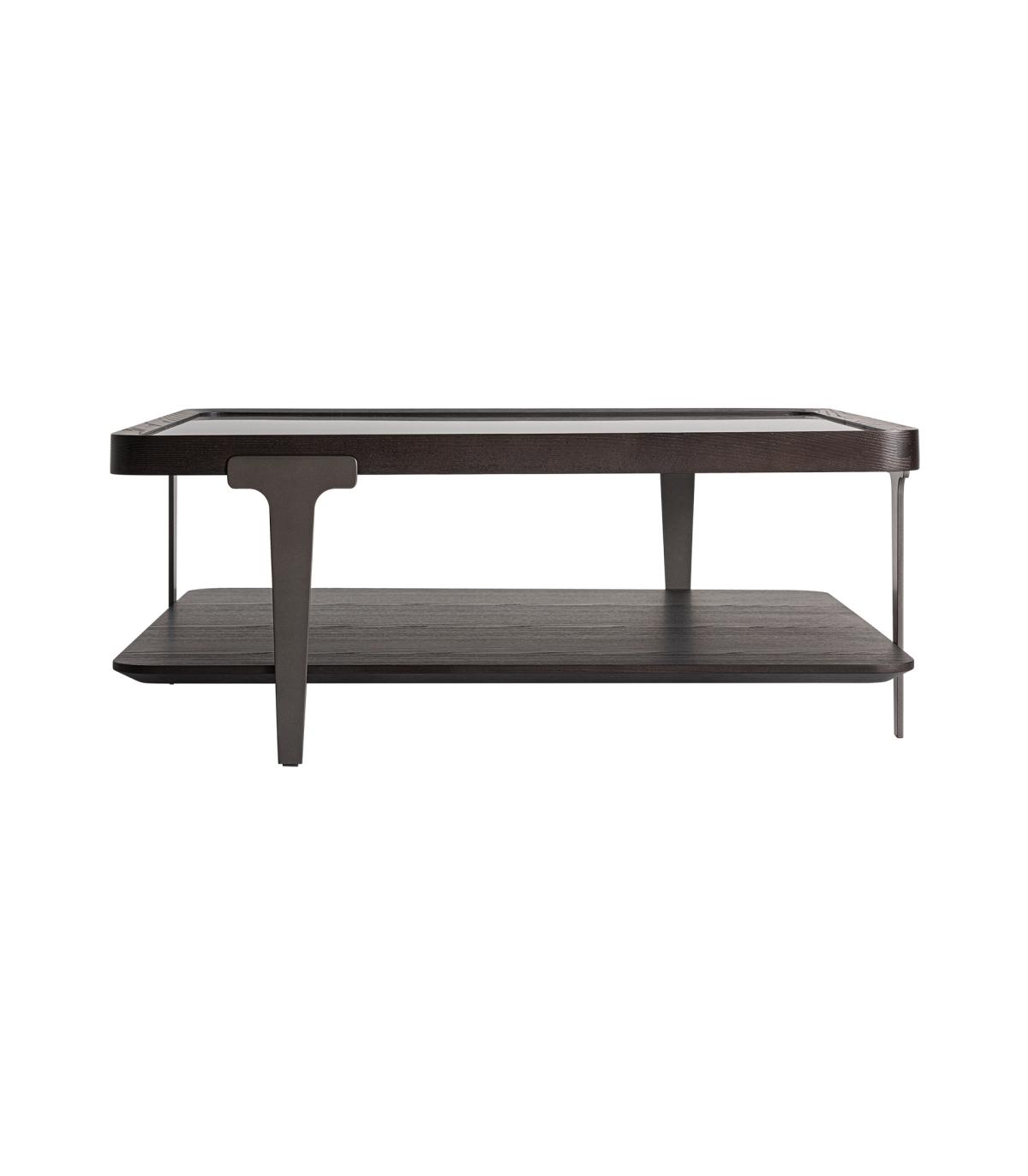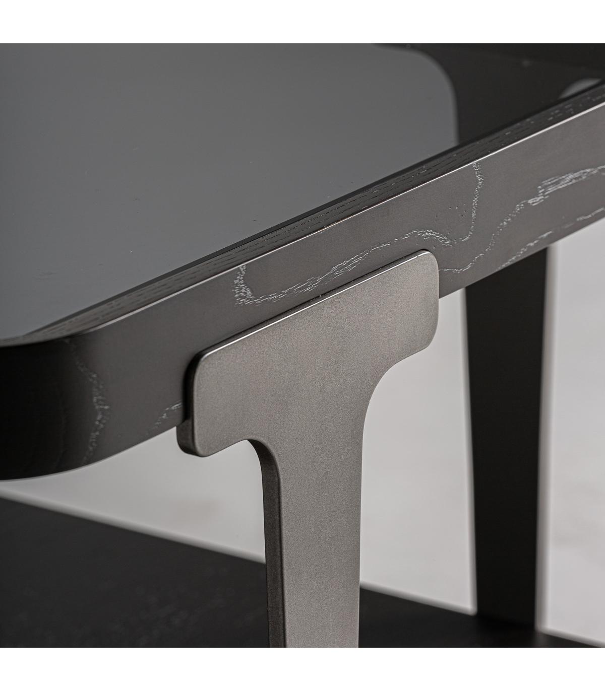Mesa de centro Breil de estilo art deco fabricado en madera de fresno en color negro combinado con cristal templado en color negro con acabado ahumado y hierro en color negro. Producto desmontable.