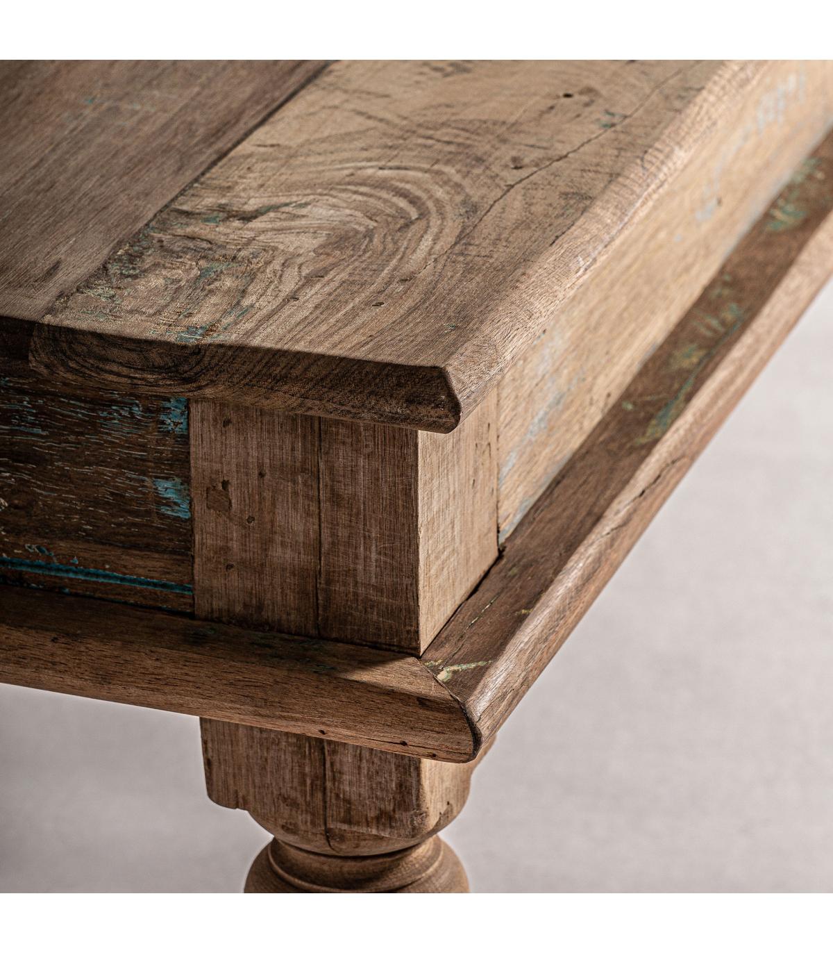 Mesa de centro carrik de estilo colonial fabricado en madera recuperada en color marrón.