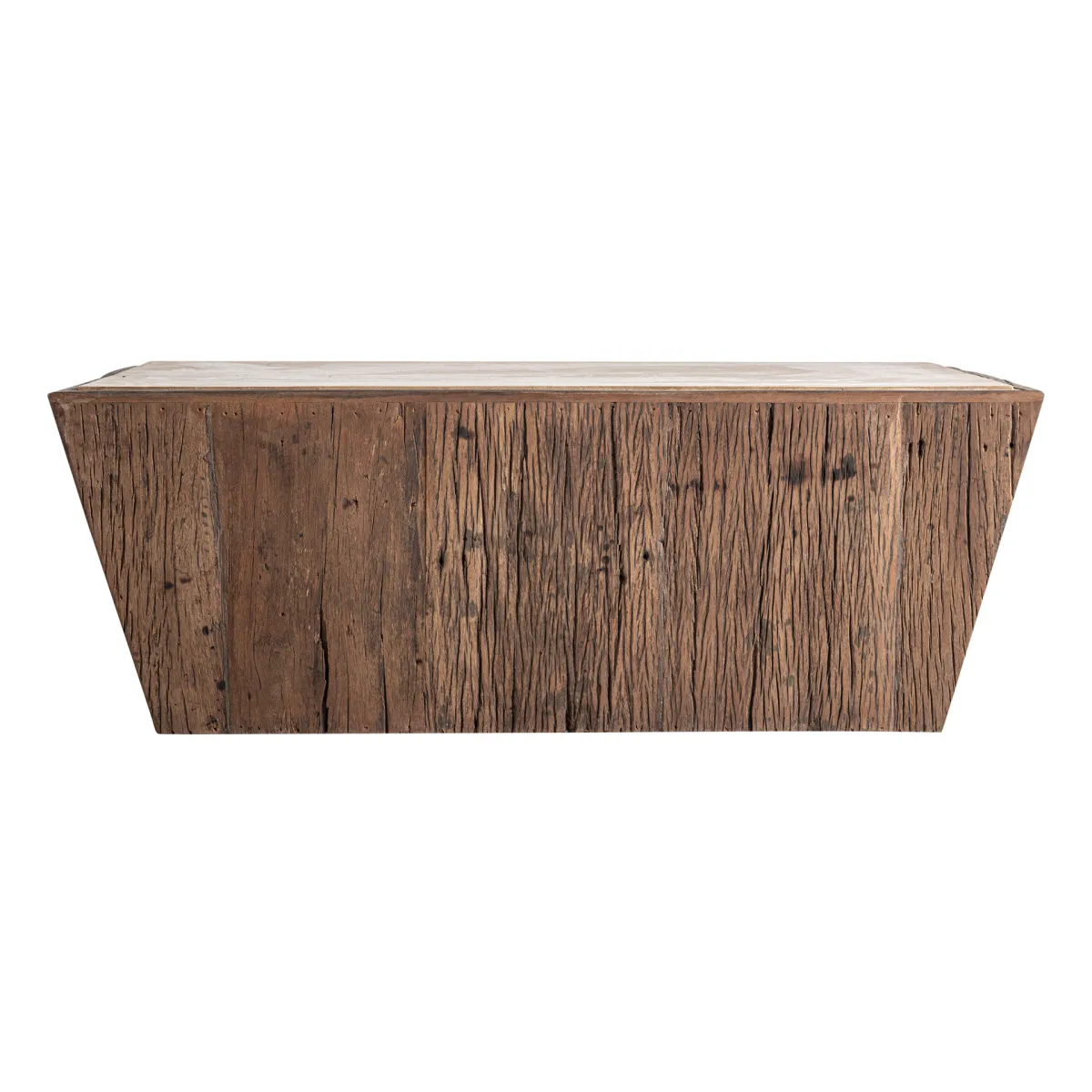Mesa de centro Merkem de estilo rústico fabricado en madera recuperada en color marrón con acabado envejecido combinado con travertino en color beige con acabado satinado.