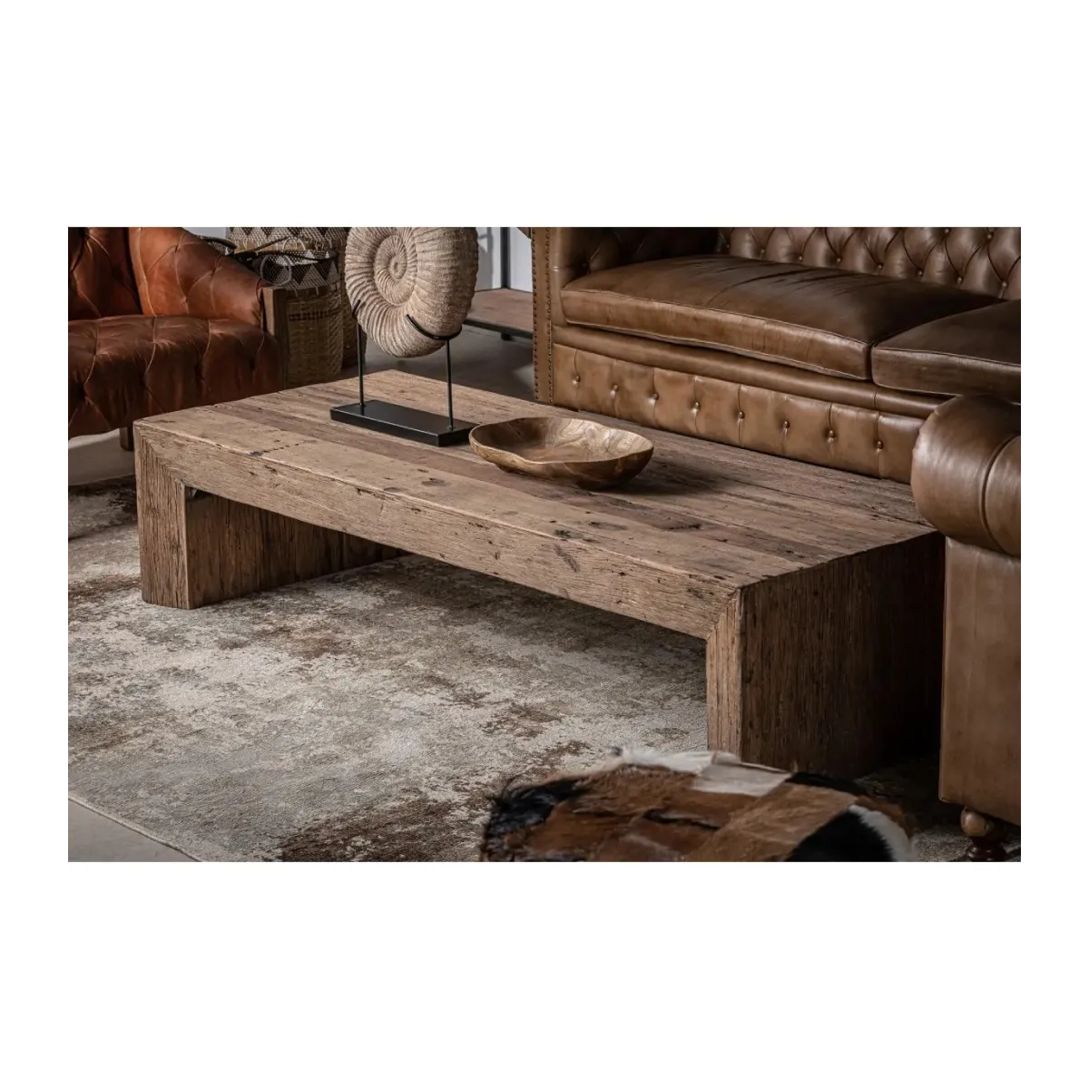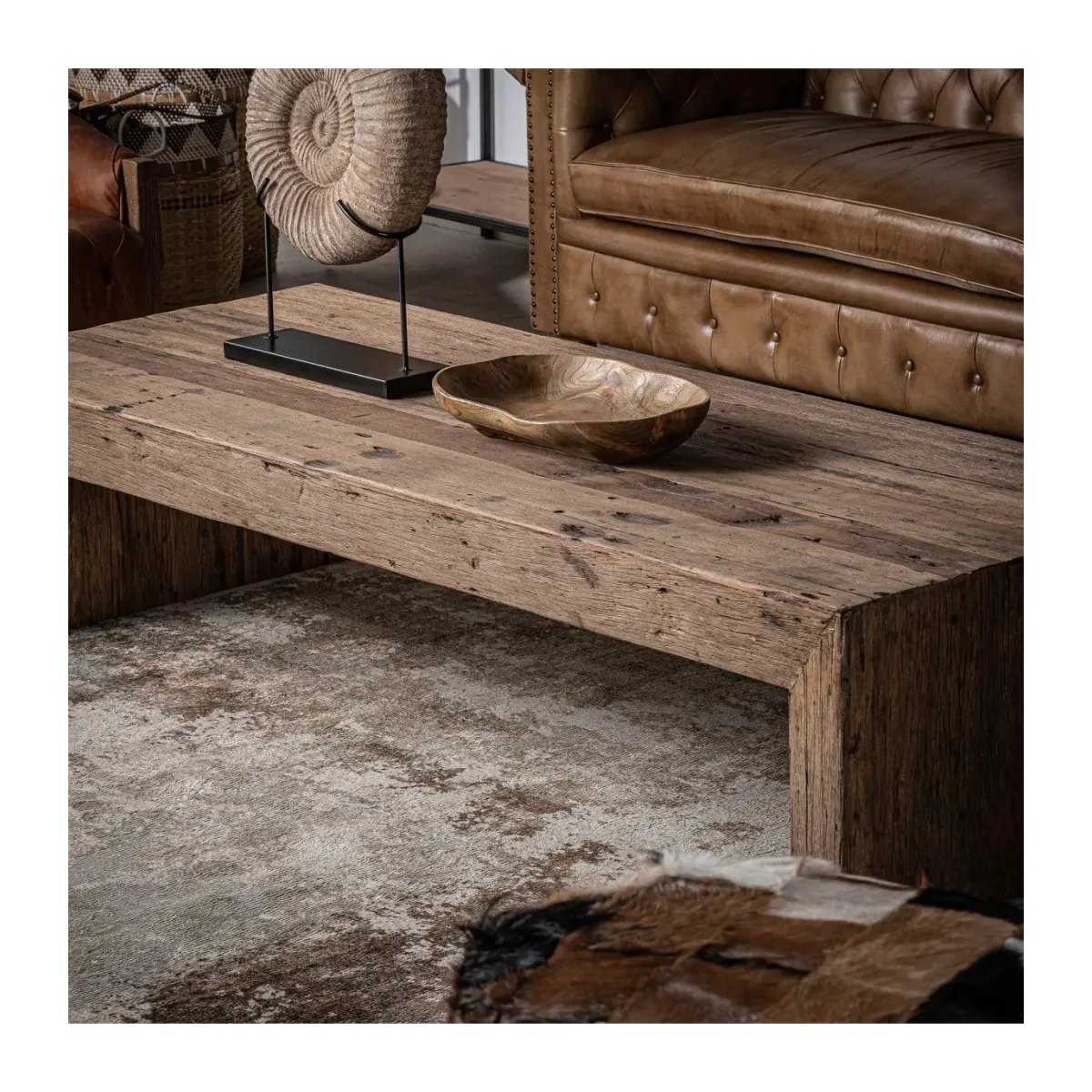 Mesa de centro samsun, en color natural envejecido, de estilo étnico. Fabricado en madera de pino reciclado. Varias maderas: pino, mango, teka, acacia.