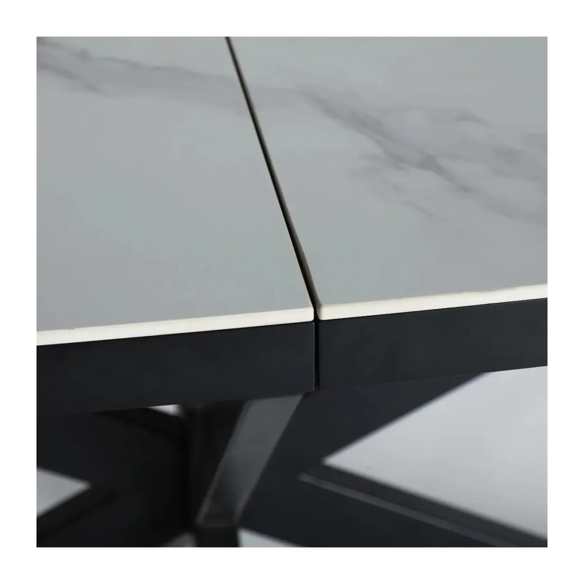 Mesa extensible Droux de estilo contemporáneo, fabricado en madera dm en color negro, combinado con cerámica en color blanco y hierro en color negro.