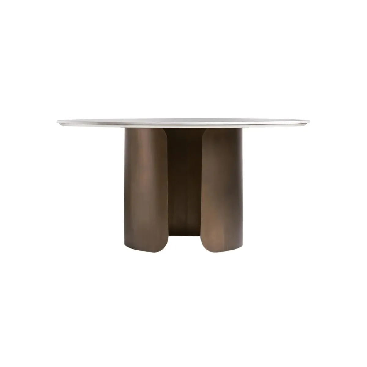 Mesa comedor vimperk de estilo art deco fabricado en porcelánico en color blanco roto combinado con acero en color marrón. Producto desmontable.