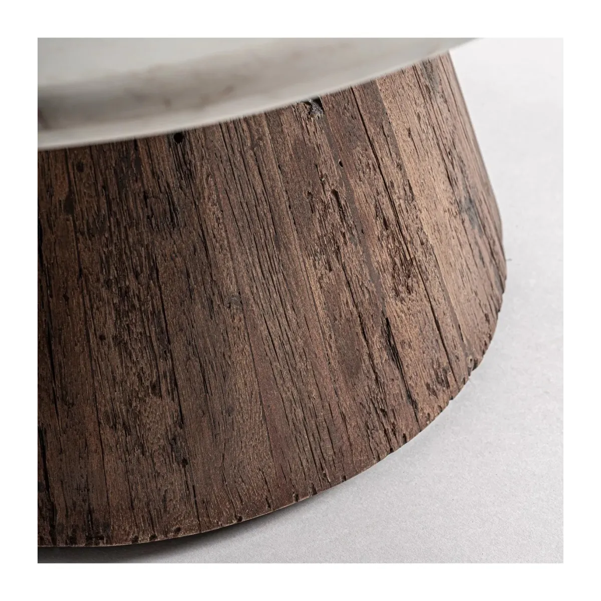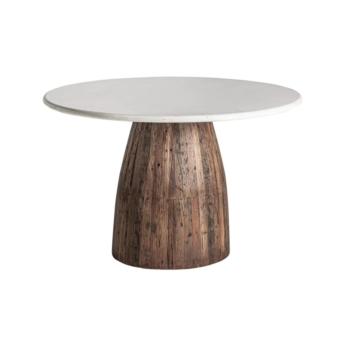 Mesa comedor skorup de estilo rústico fabricado en madera recuperada en color marrón con acabado envejecido combinado con mármol en color blanco.
