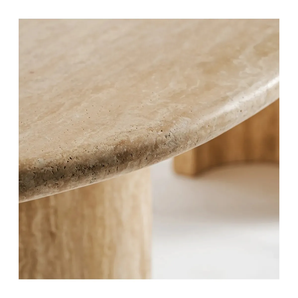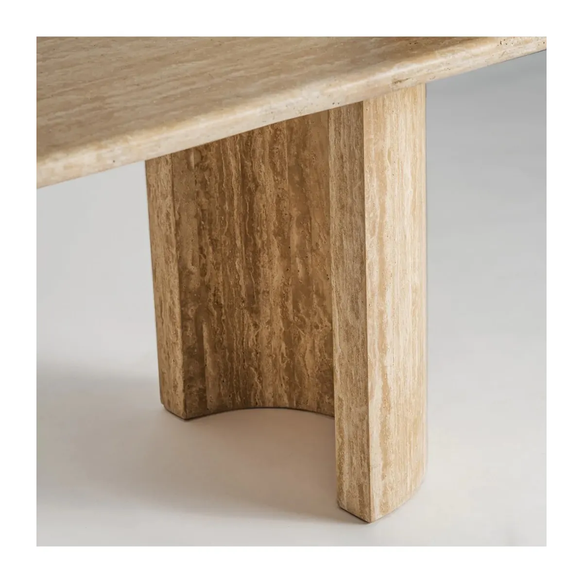 Mesa comedor thiennes de estilo art deco fabricado en travertino en color marrón claro. Producto desmontable.