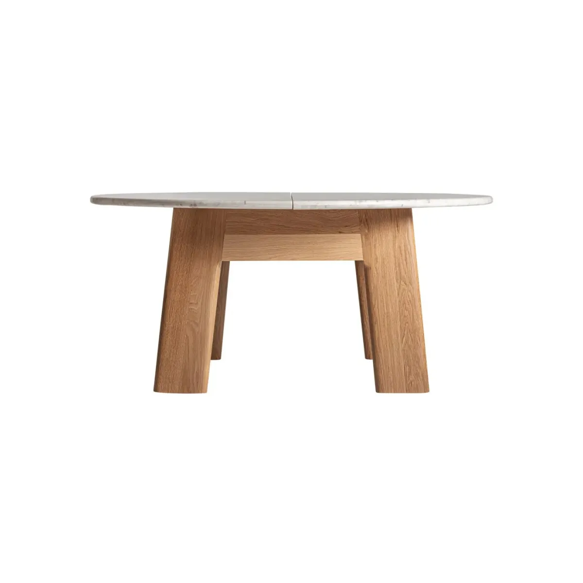 Mesa comedor nara de estilo contemporáneo fabricado en mármol en color blanco combinado con madera roble en color marrón claro. Producto desmontable.