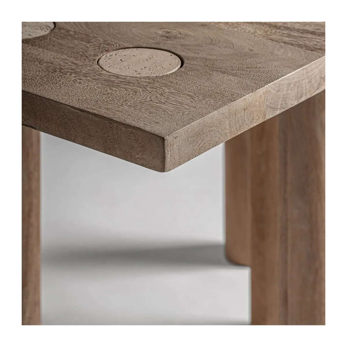 Mesa comedor jacquard de estilo contemporáneo. Fabricado en madera de mango en color marrón claro combinado con travertino en color marrón. Producto desmontable.