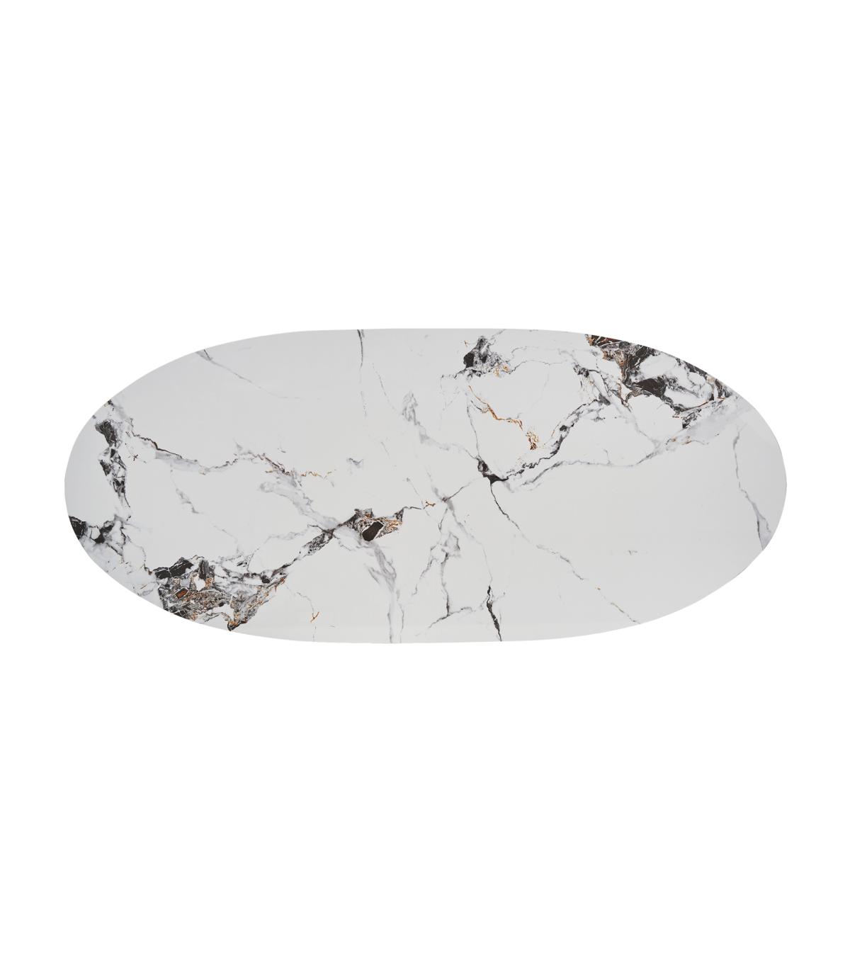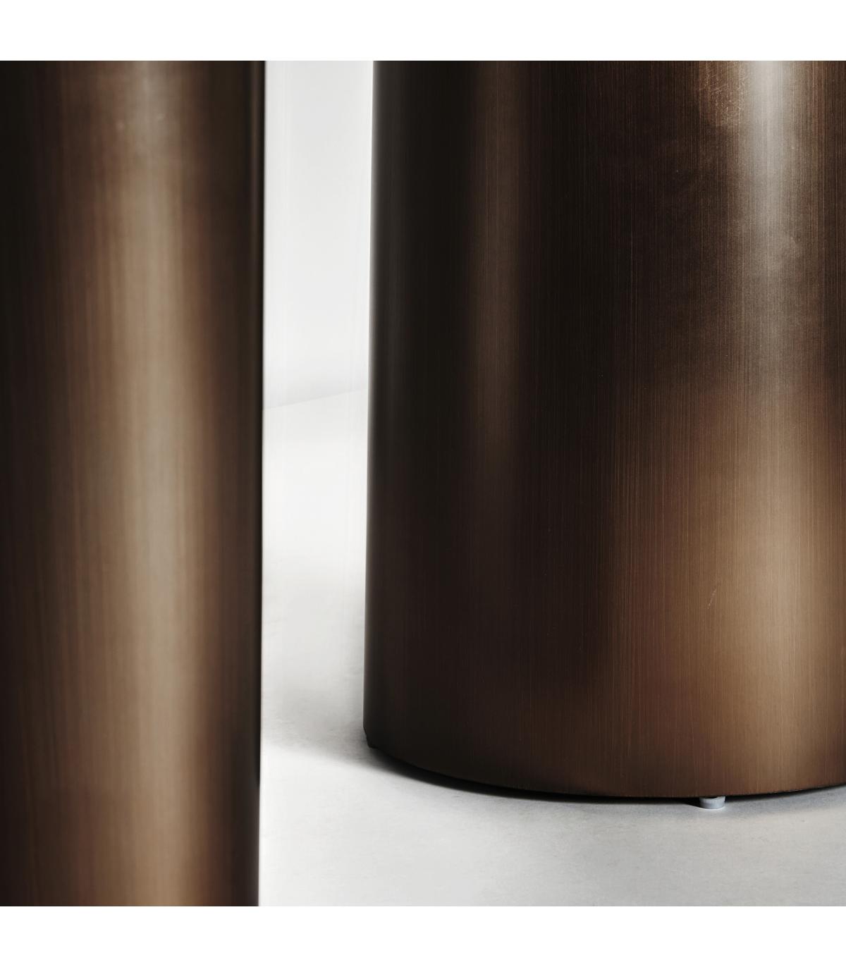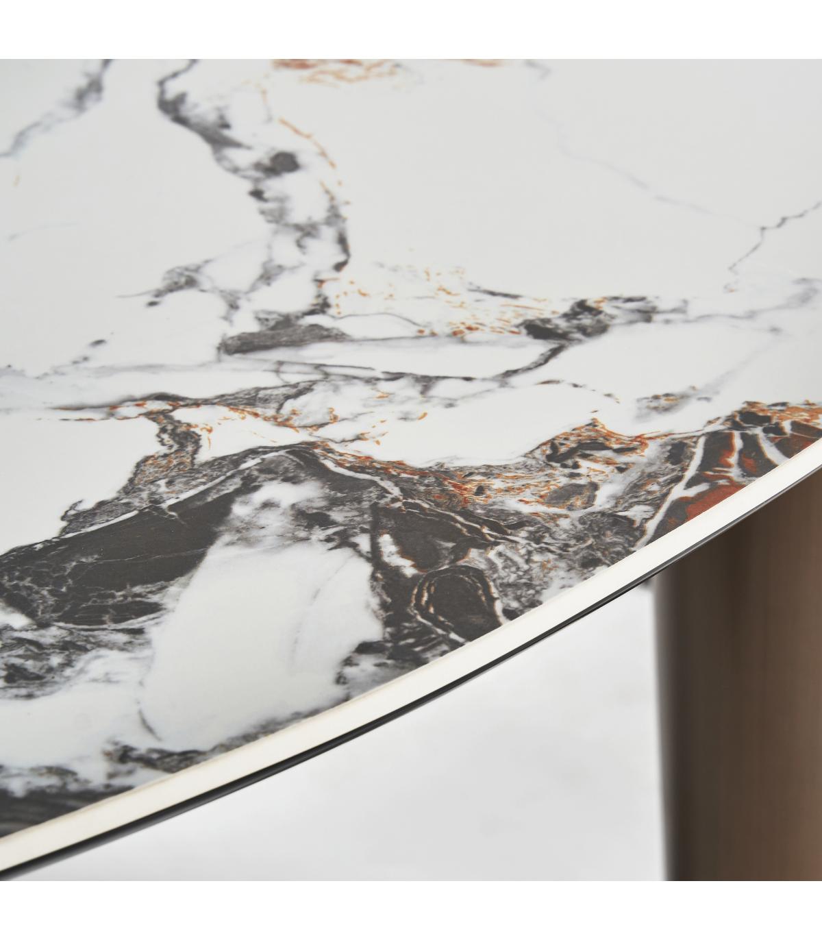 Mesa comedor Laggan de estilo art deco fabricado en acero en color bronce combinado con porcelánico en color blanco. Producto desmontable.