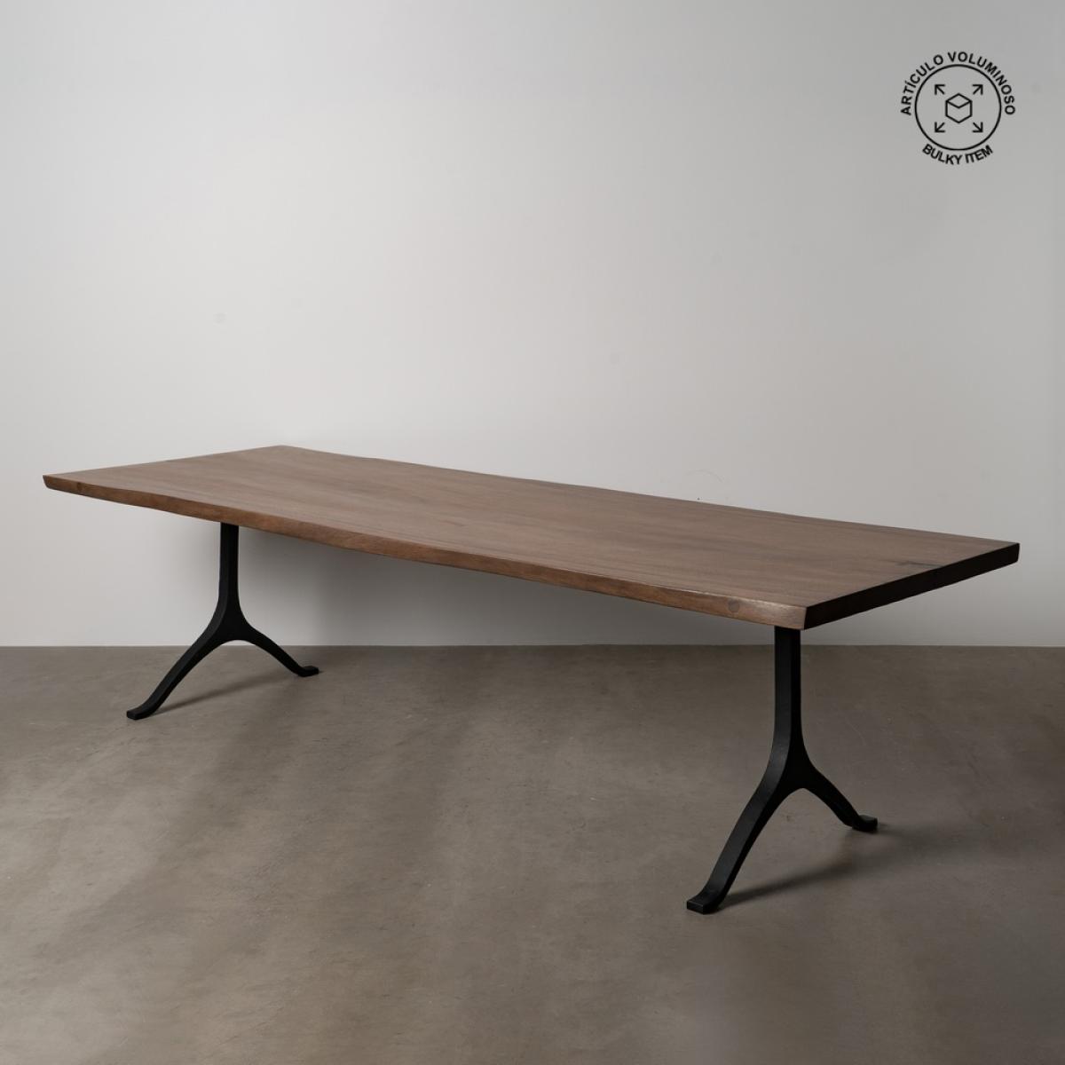 MESA COMEDOR MADERA-METAL SALÓN 300 X 90 X 77 CM Material: madera de suar, hierro. Distancia entre patas: 221cm. El ancho de la mesa puede variar entre 80cm y 95cm, ya que cada pieza es única. Esto se debe a que se obtiene directamente del corte del tronco del árbol, y la medida final depende del grosor específico del mismo.
