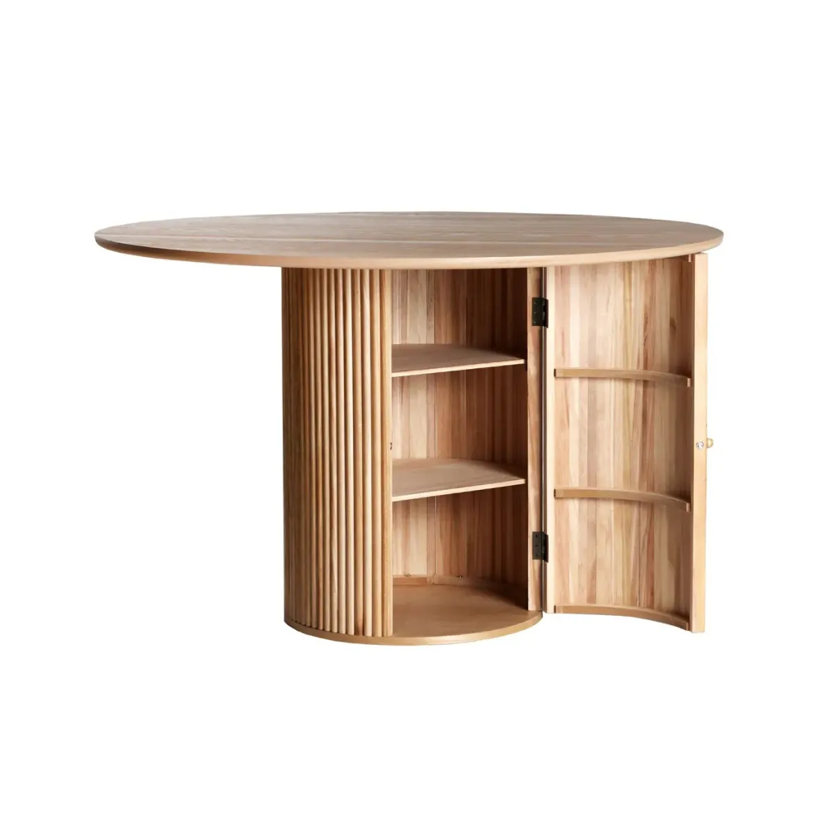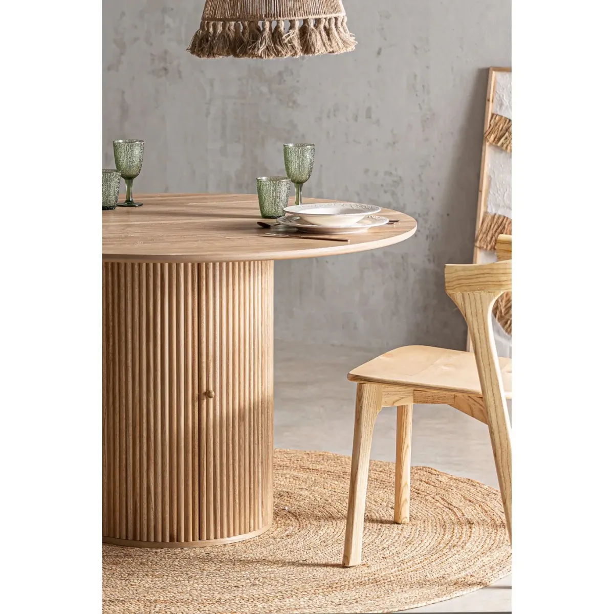 Mesa comedor redonda skagen, en color natural, de estilo nórdico. Fabricado en madera de paulownia, combinado con madera de fresno. Producto desmontable.