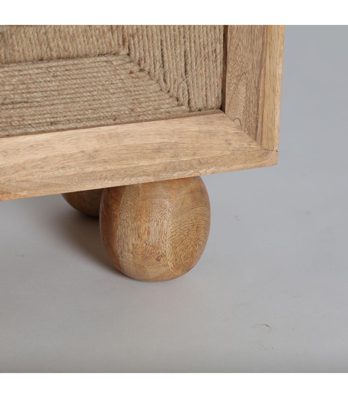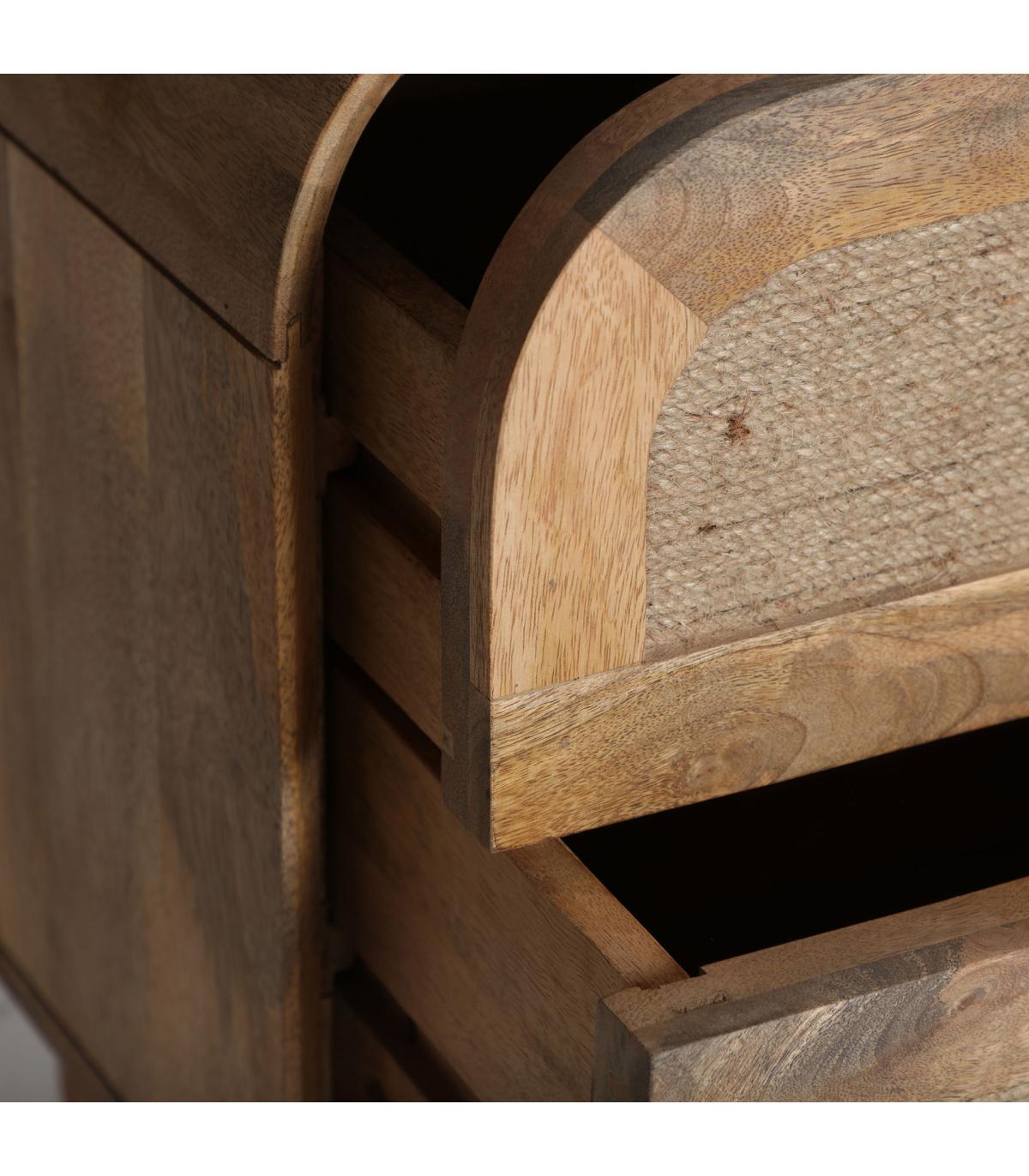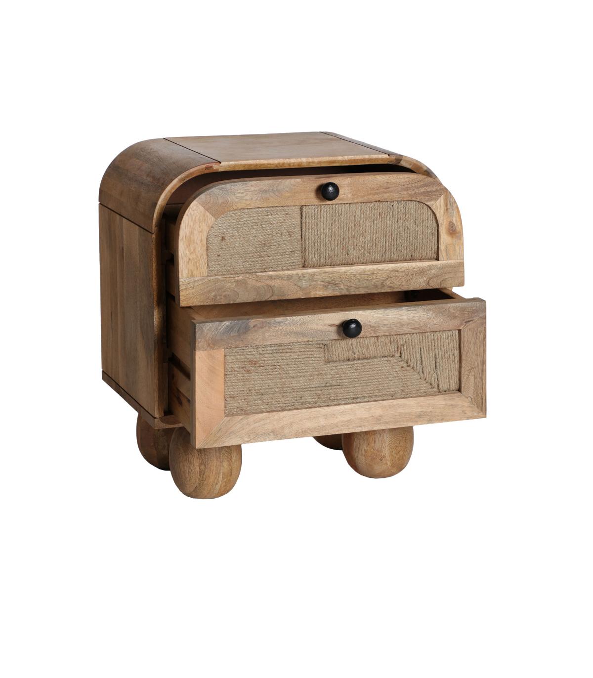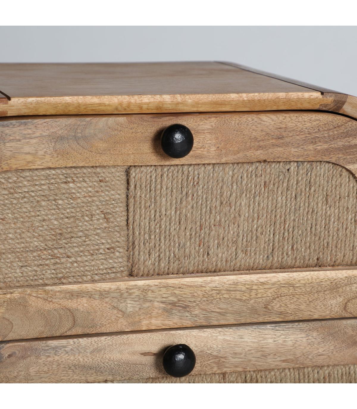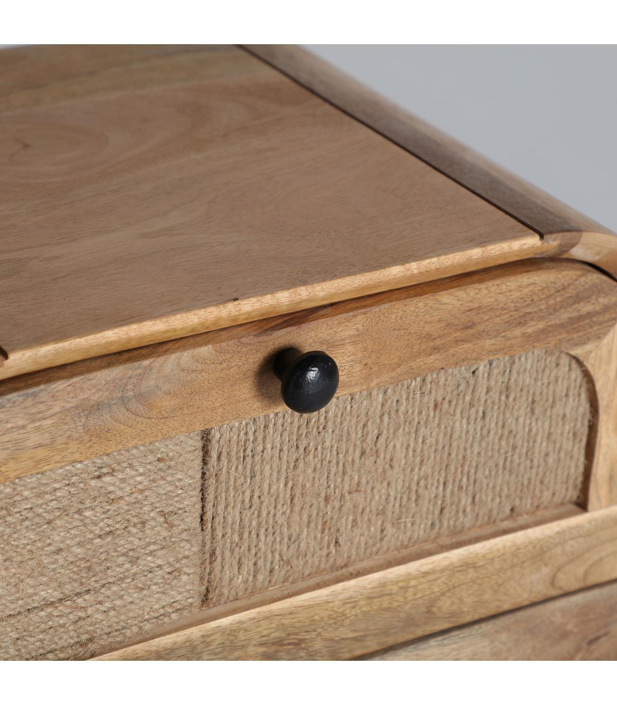 Mesita de noche vorey de estilo contemporáneo, fabricado en madera de mango en color marrón, combinado con yute. Producto desmontable.