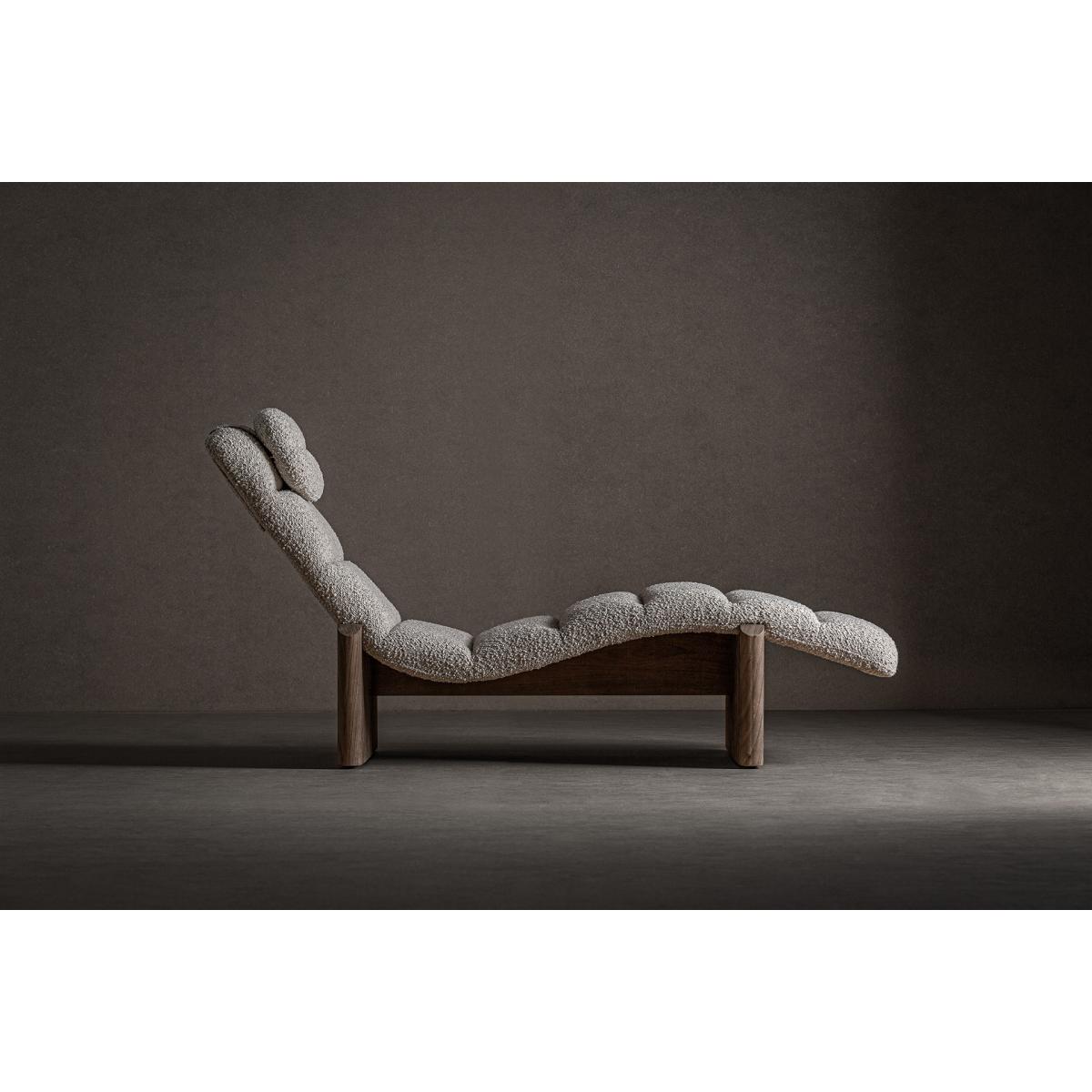 Chaise longue jacquard de estilo contemporáneo. Fabricado en madera roble en color marrón combinado con poliéster en color beige.
