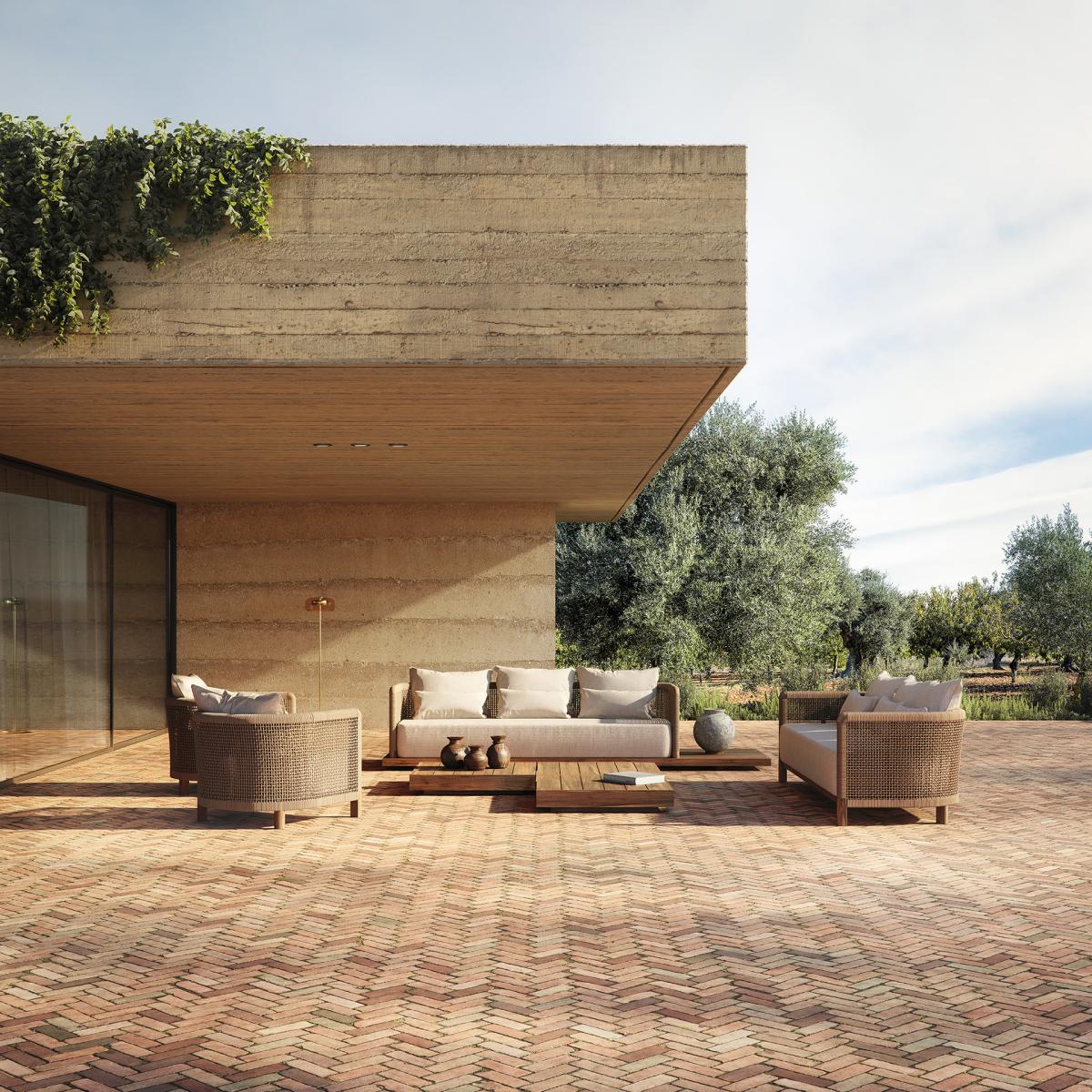 Sofá trena de estilo boho fabricado en madera de teka reciclada en color marrón con acabado natural combinado con polipropileno reciclado en color beige y espuma. Producto desmontable desenfundable.