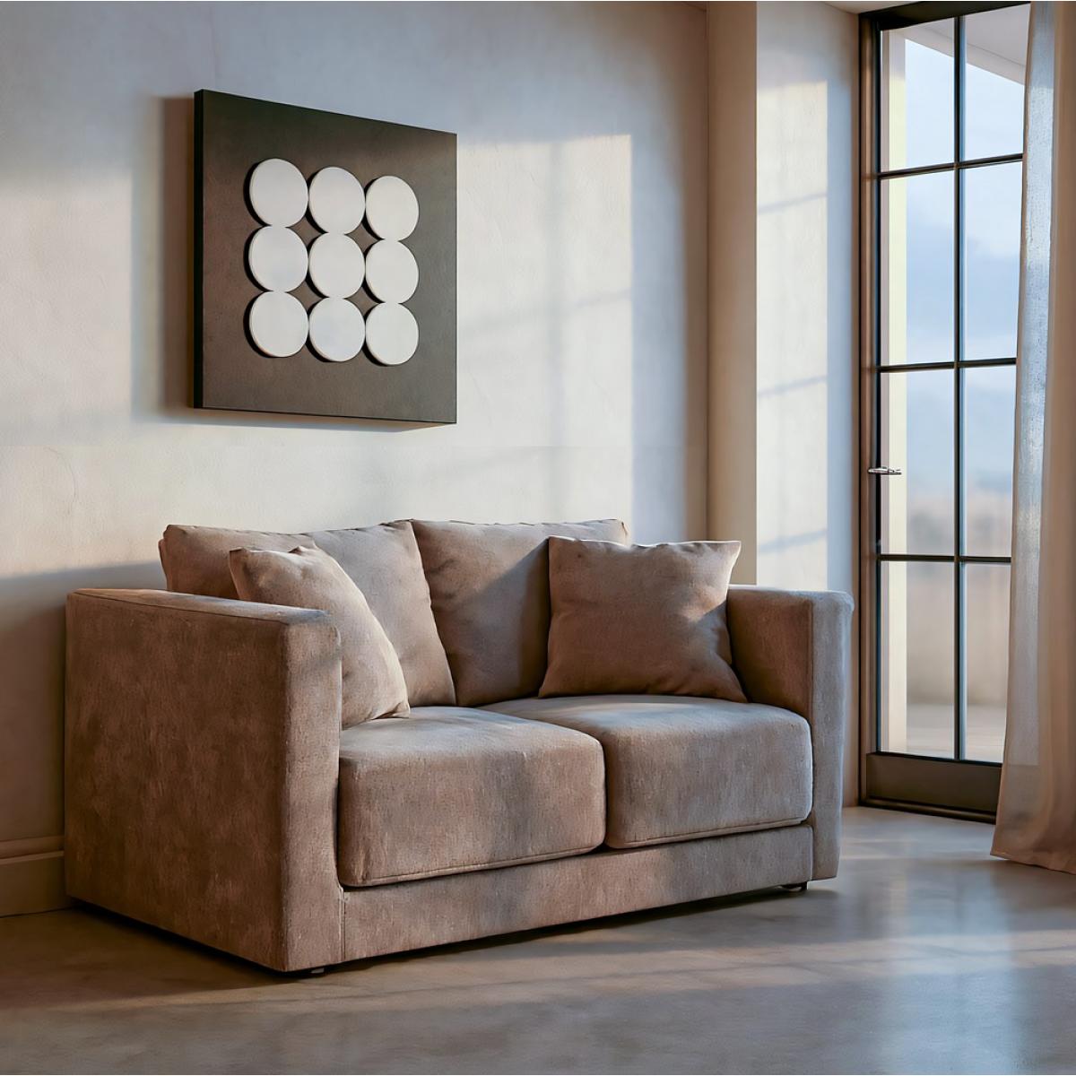 SOFÁ 2 PLAZAS TAUPE TEJIDO-MADERA 165 X 96 X 86 CM Material: tejido - madera conglomerada - patas madera de caucho. Tejido: 100% poliéster Cojines laterales y traseros desenfundables. Altura asiento: 47cm. Altura respaldo: 47cm. Profundo asiento: 68cm. Ancho asiento: 135cm. Altura reposabrazos (desde suelo): 74cm. Medida cojines laterales: 50x50cm. Medida cojines respaldo: 68x47cm. Cumple normativa EN12520 Patas para montar