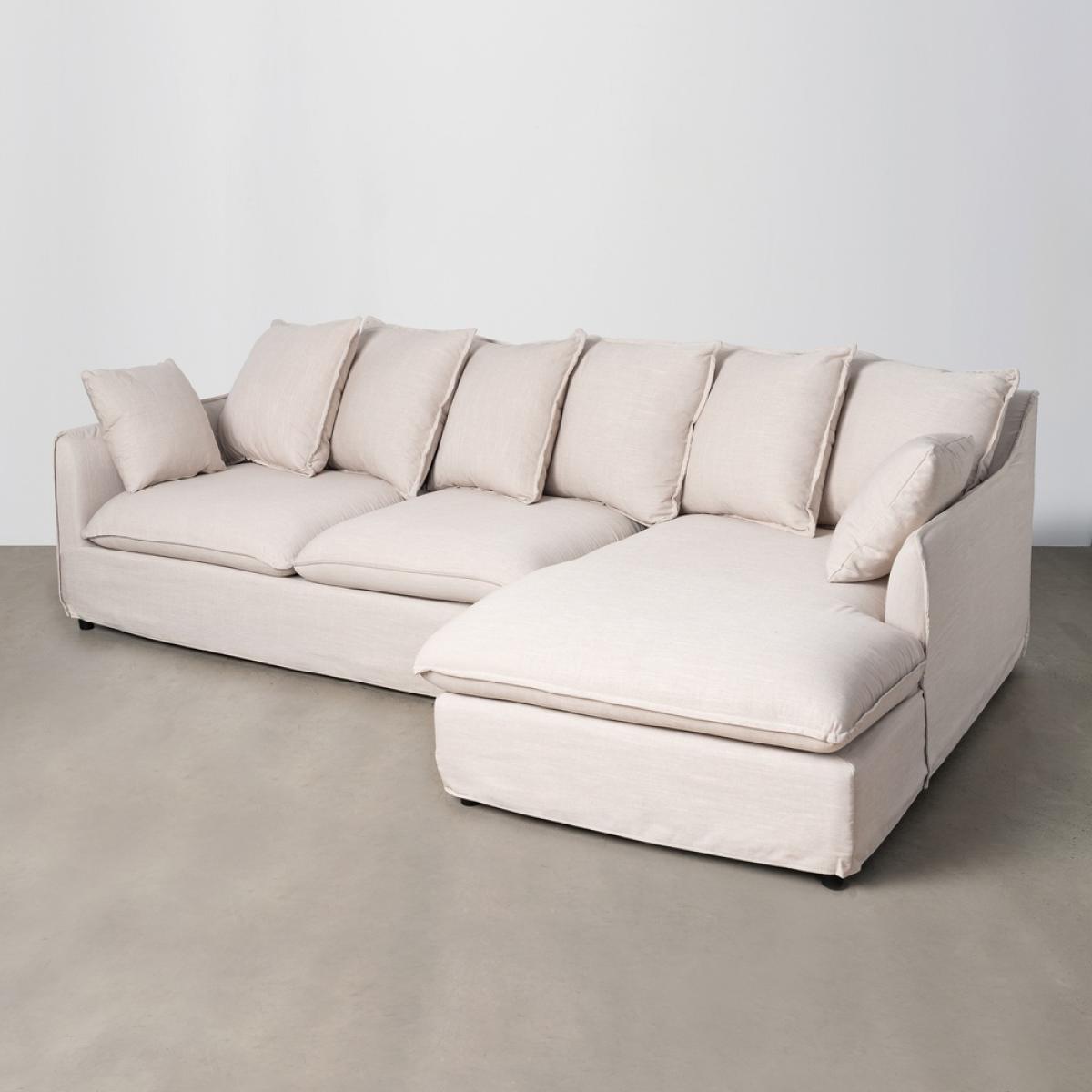 SOFÁ CHAISE LONGUE BEIGE DM-TEJIDO SALÓN 252 X 158 X 84 CM Tejido: Poliéster-lino. DENSIDAD: 28 Kg/m3. Patas de plástico, color negro. Estructura: Madera de pino. Altura del asiento: 44 cm Altura del reposabrazos:60 cm. Cojines desenfundables. Medidas de 2 cojines pequeños:40x40cm. medidas de 6 cojines grandes:55x55cm. Longitud de la chaise longue:100cm. Lavar en seco. Las patas requieren montaje. Peso máximo soportado:300kgs. Cumple con la normativa UNE-EN 12520:2025.