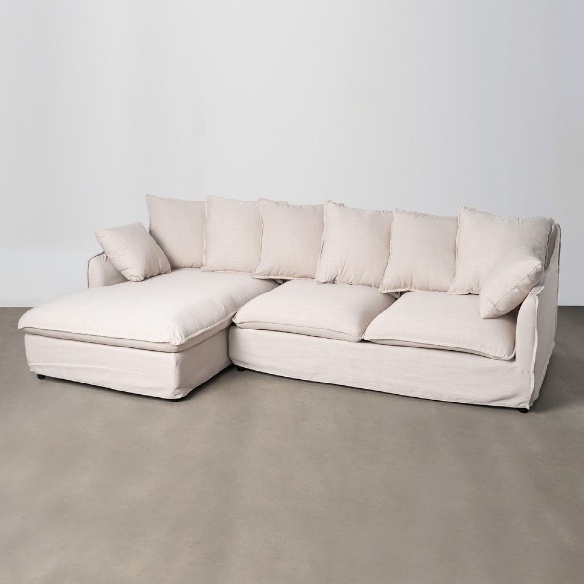 SOFÁ CHAISE LONGUE BEIGE DM-TEJIDO SALÓN 254 X 158 X 84 CM Tejido: Poliéster-lino. DENSIDAD: 28 Kg/m3. Patas de plástico, color negro. Estructura: Madera de pino. Altura del asiento: 44 cm Altura del reposabrazos:60 cm. Cojines desenfundables. Medidas de 2 cojines pequeños:40x40cm. medidas de 6 cojines grandes:55x55cm. Longitud de la chaise longue:100cm. Lavar en seco. Las patas requieren montaje. Peso máximo soportado:300kgs. Cumple con la normativa UNE-EN 12520:2025.