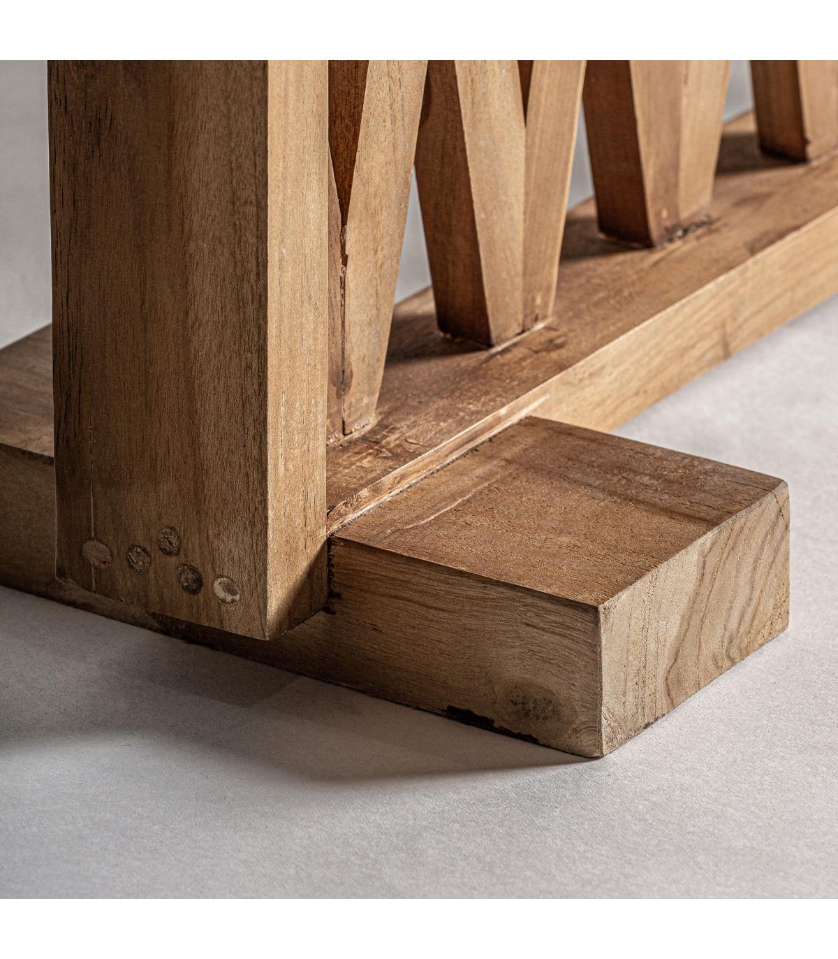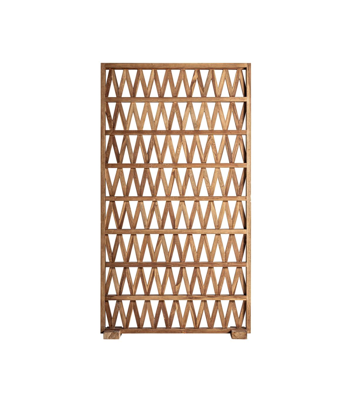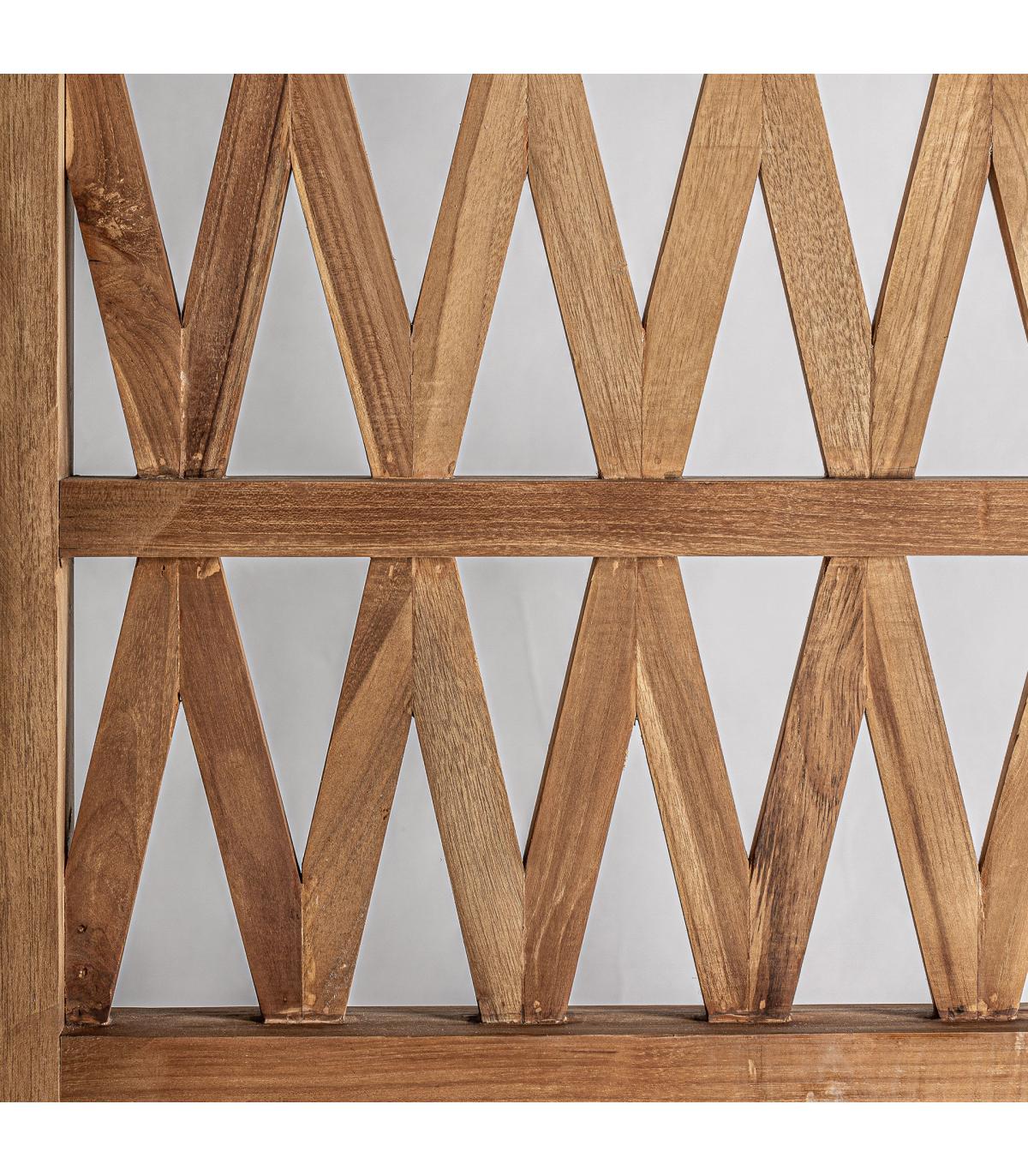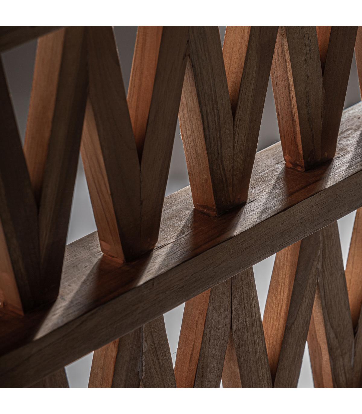 Parabán viriat de estilo boho fabricado en madera de teka en color marrón.