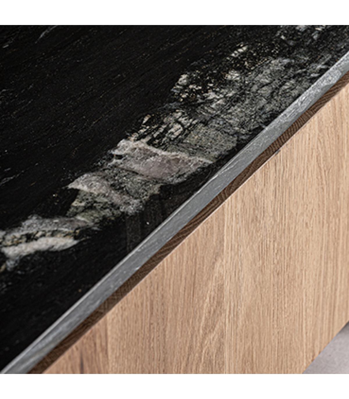 Mueble tv nara de estilo contemporáneo fabricado en madera roble en color marrón claro combinado con mármol en color negro. Producto desmontable.