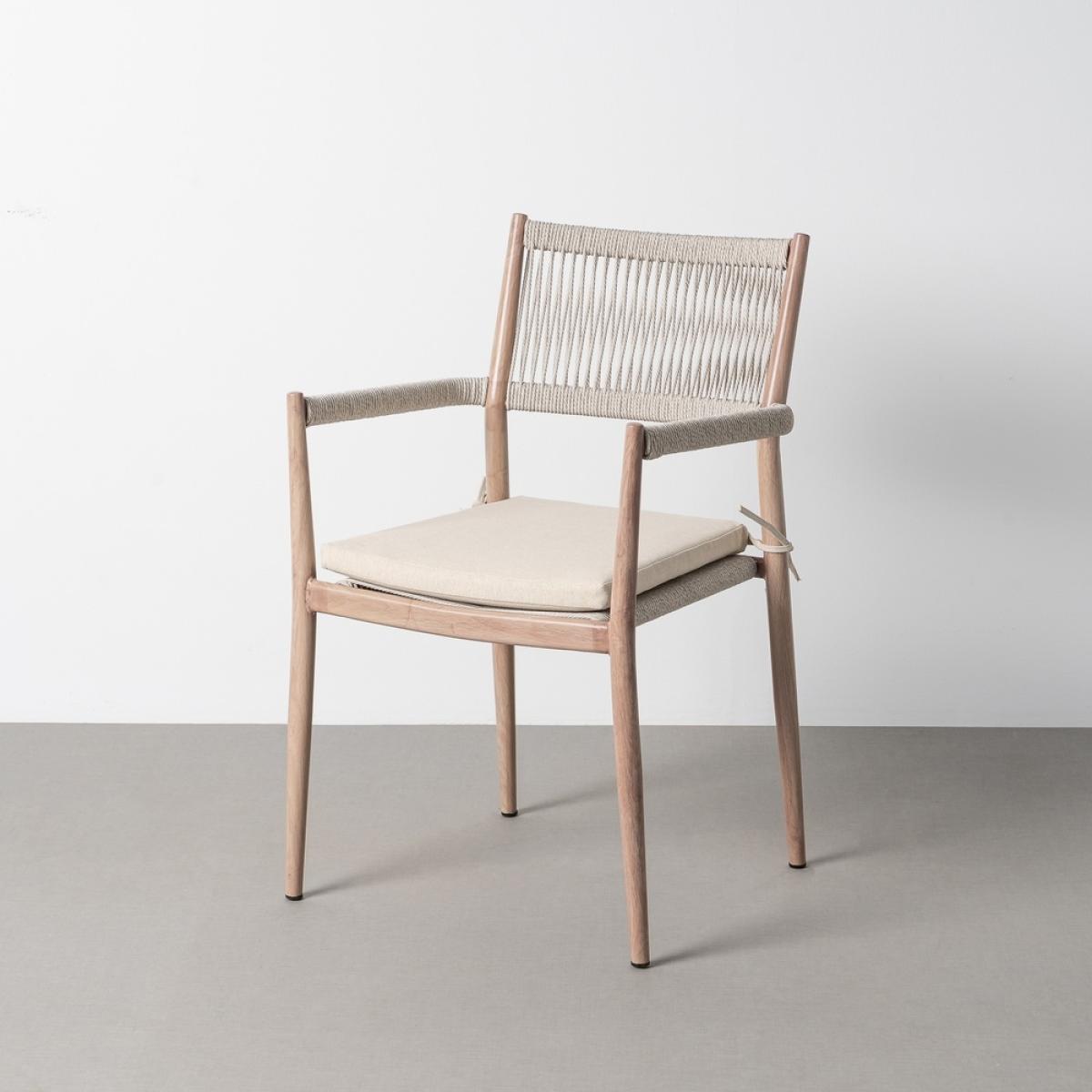 SILLA ACERO-RATTÁN PE EXTERIOR 55 X 55 X 85 CM Material: acero, PE ratán. Altura asiento: 47cm. Ancho asiento: 43cm. Profundidad asiento: 44cm. Altura respaldo: 40cm. Altura reposabrazos: 21cm (66cm desde el suelo). Tejido 100% olefina. Relleno de foam y polifibra. Cojines desenfundables. Cumple la normativa EN581 (uso exterior). Los muebles y productos de exterior son aptos para permanecer a la intemperie durante la temporada, sin embargo se recomienda colocarlos bajo techado o protegerlos de la lluvia, ya que el tejido no es a prueba de agua. Una vez acabada la temporada, se recomienda guardar o proteger adecuadamente para asegurar su mantenimiento.