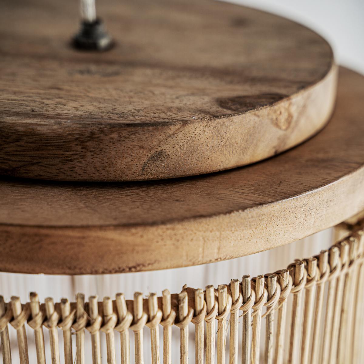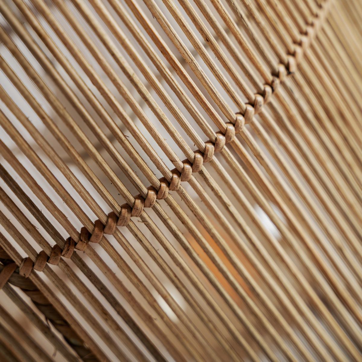 Lámpara de colgar fabricado en ratán en color marrón claro combinado con madera suar en color marrón.