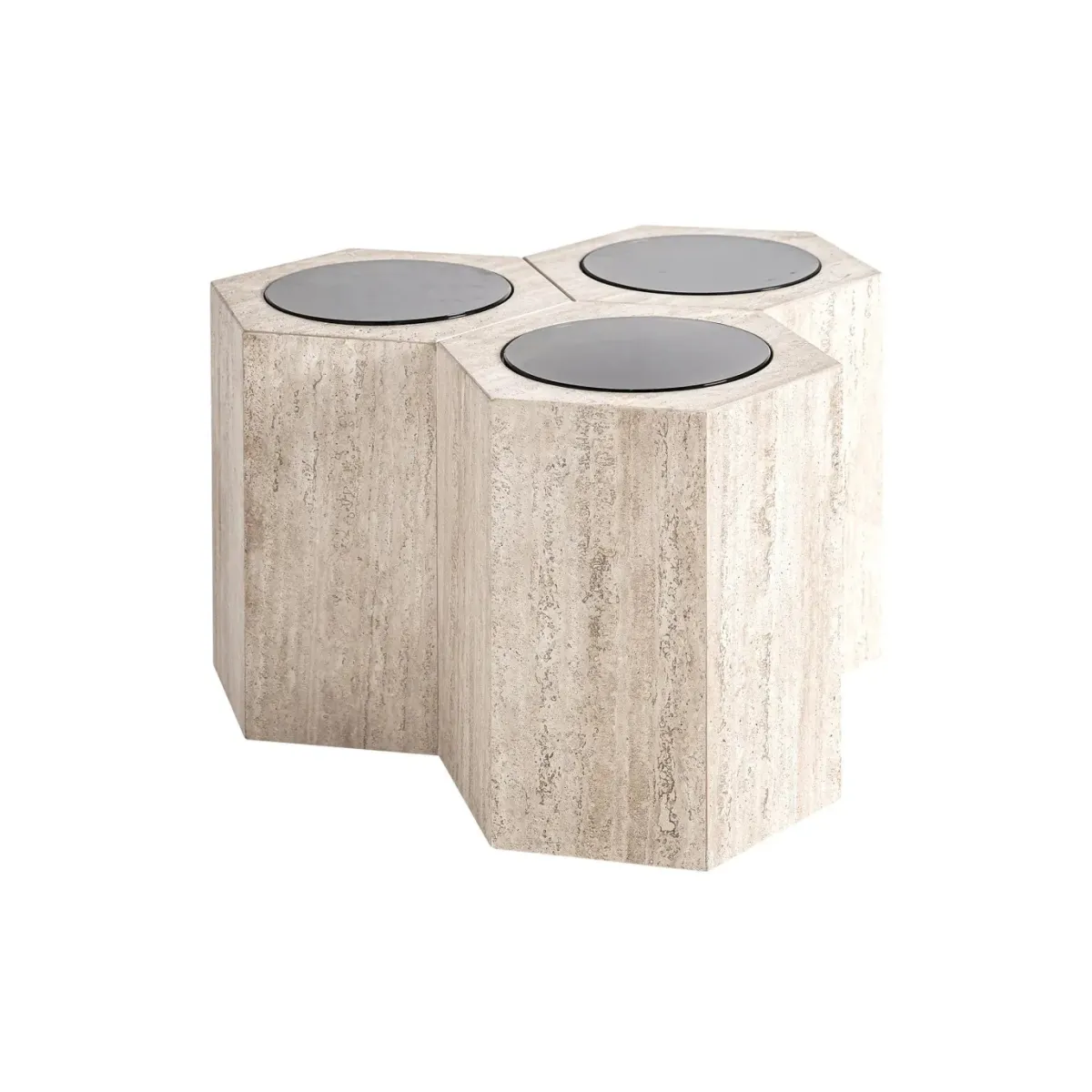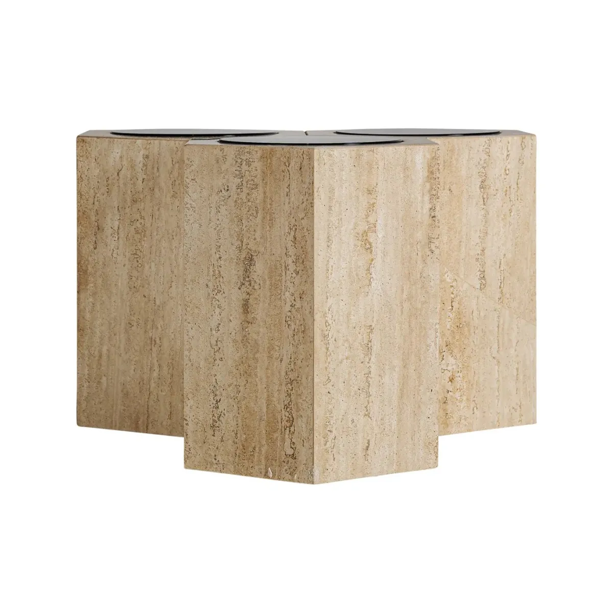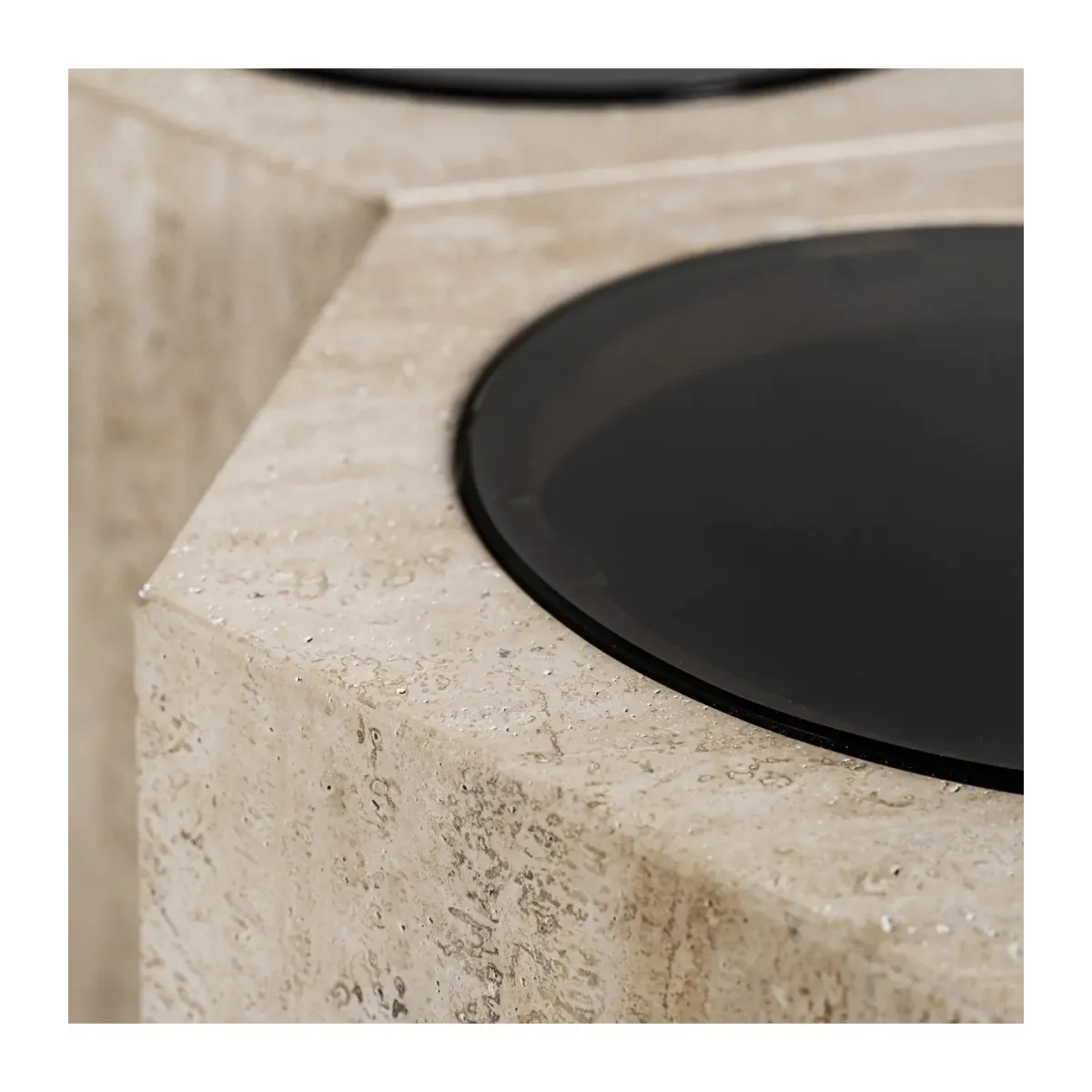 Mesa auxiliar. Fabricado en travertino, en color beige, combinado con cristal, en color ambar.