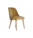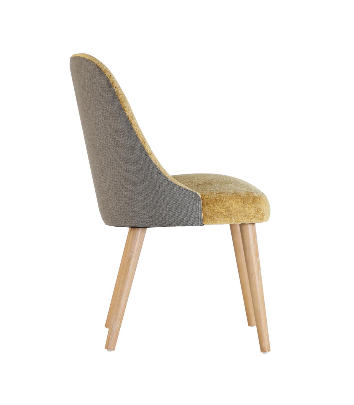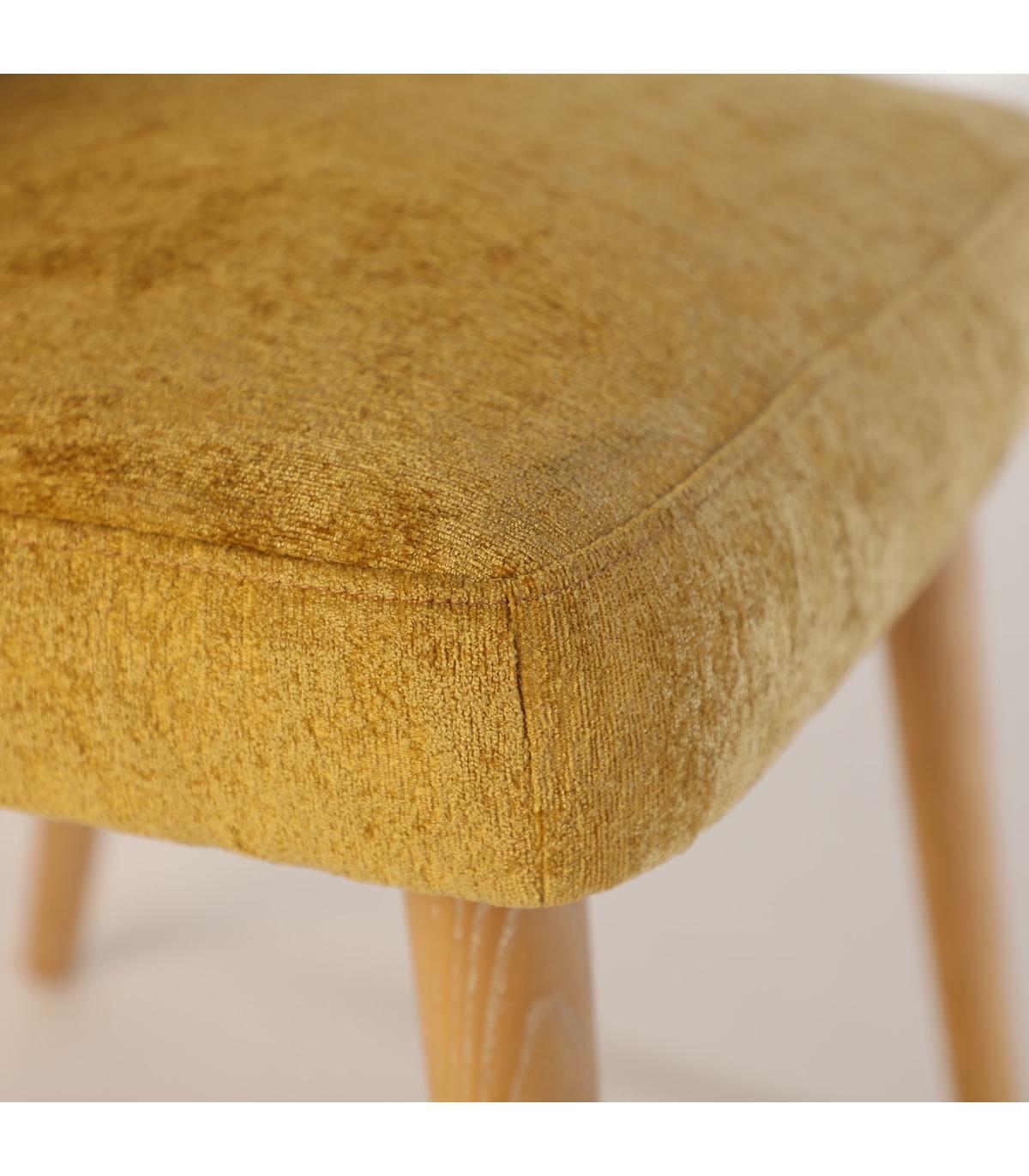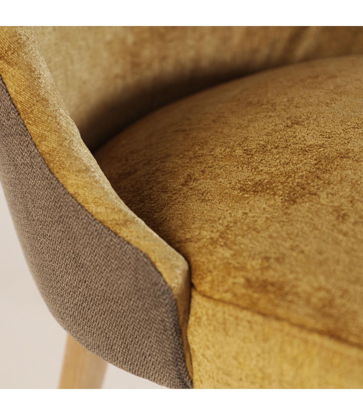 Silla Lage de estilo kitsh fabricado en madera de abeto en color marrón claro combinado con poliéster en color ocre y lino en color tonos neutros. Espuma. Producto desmontable.