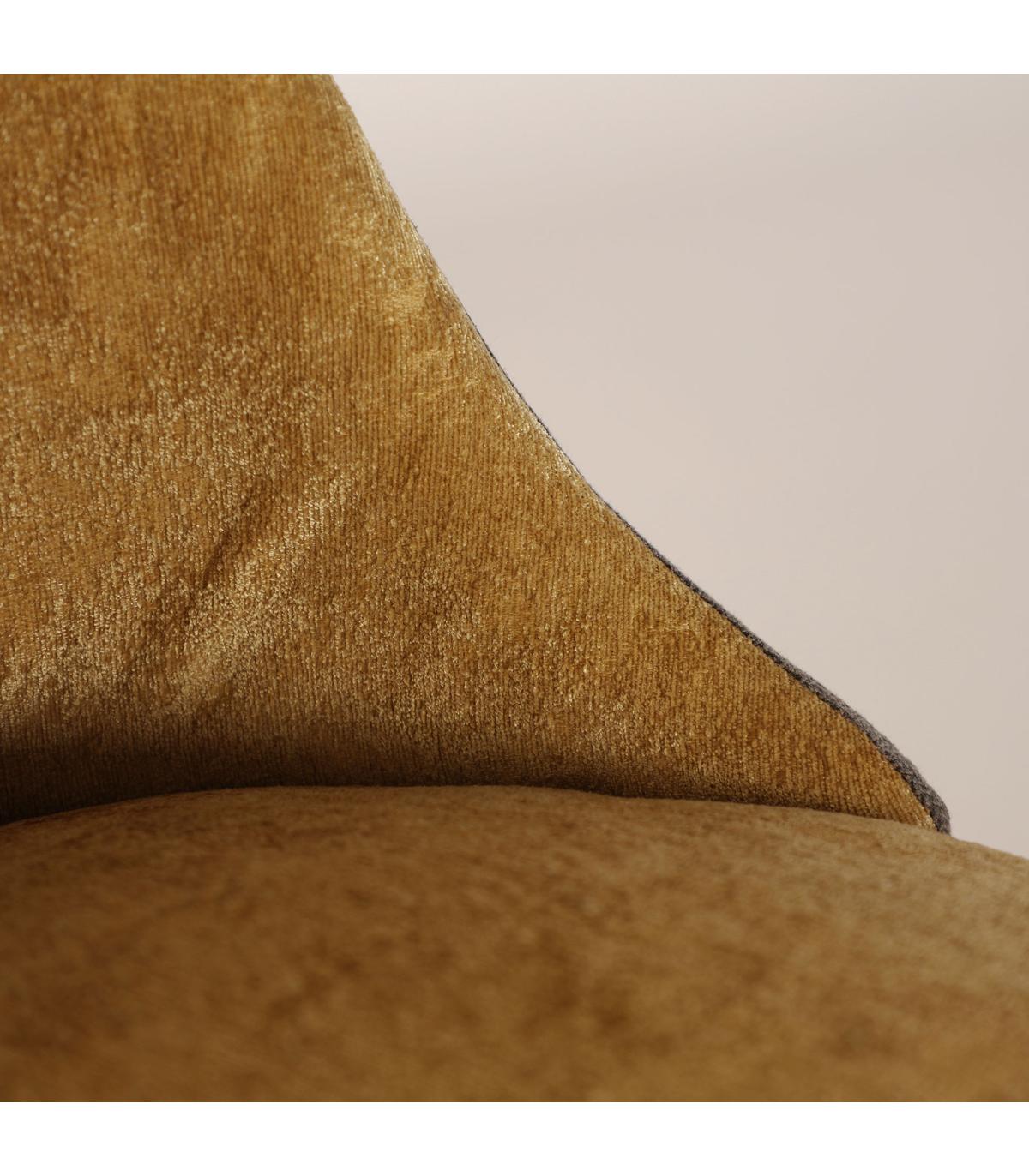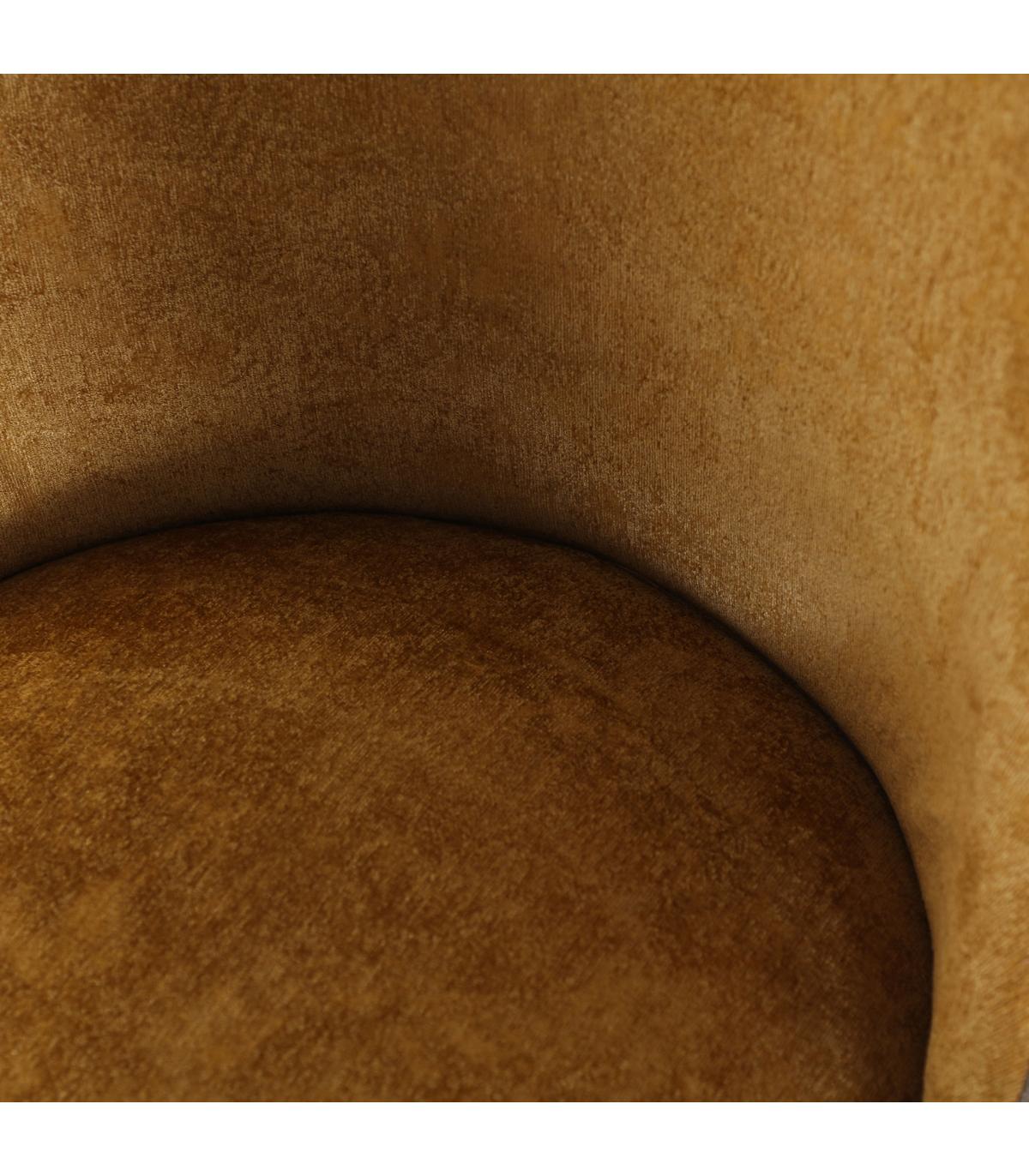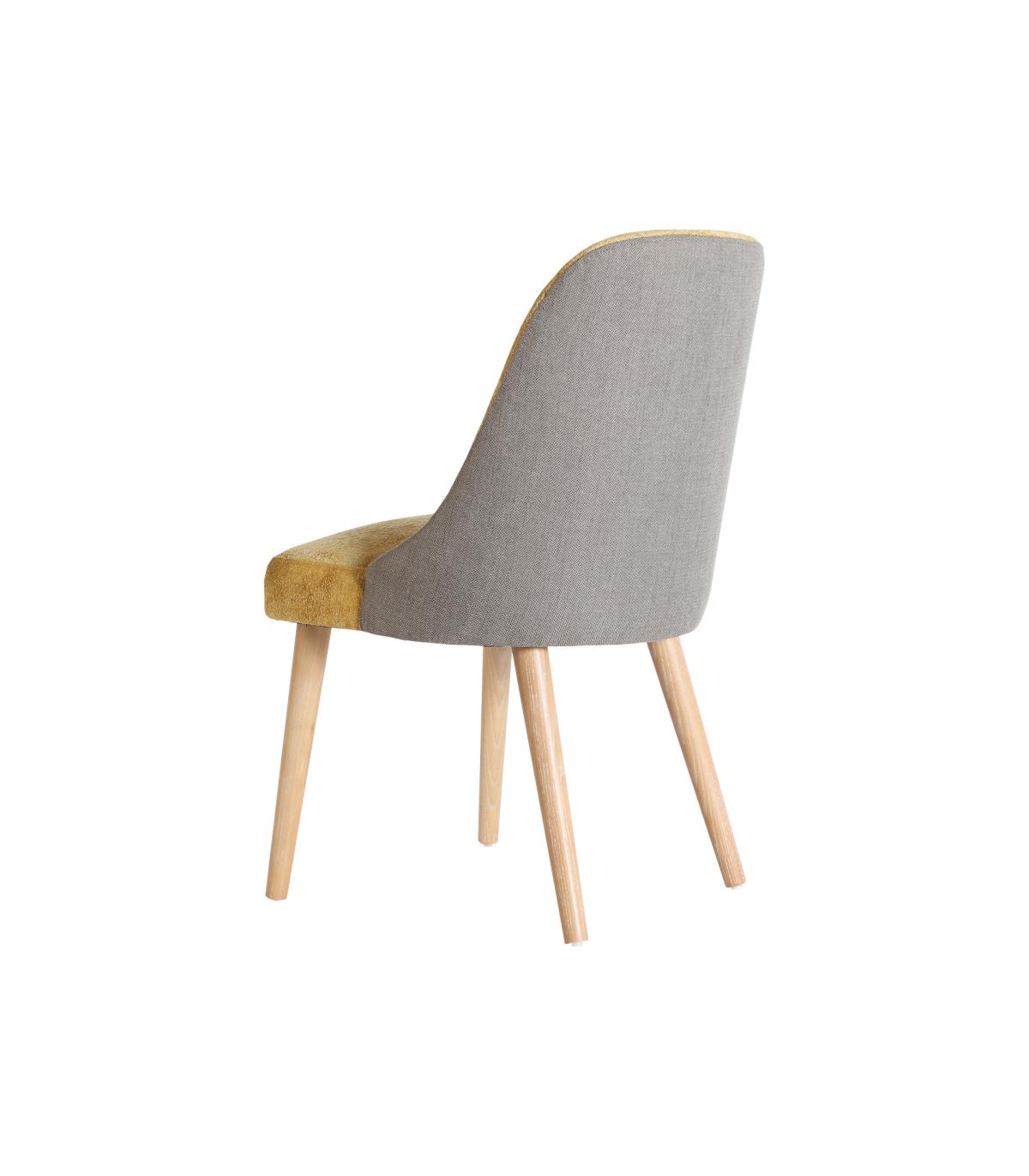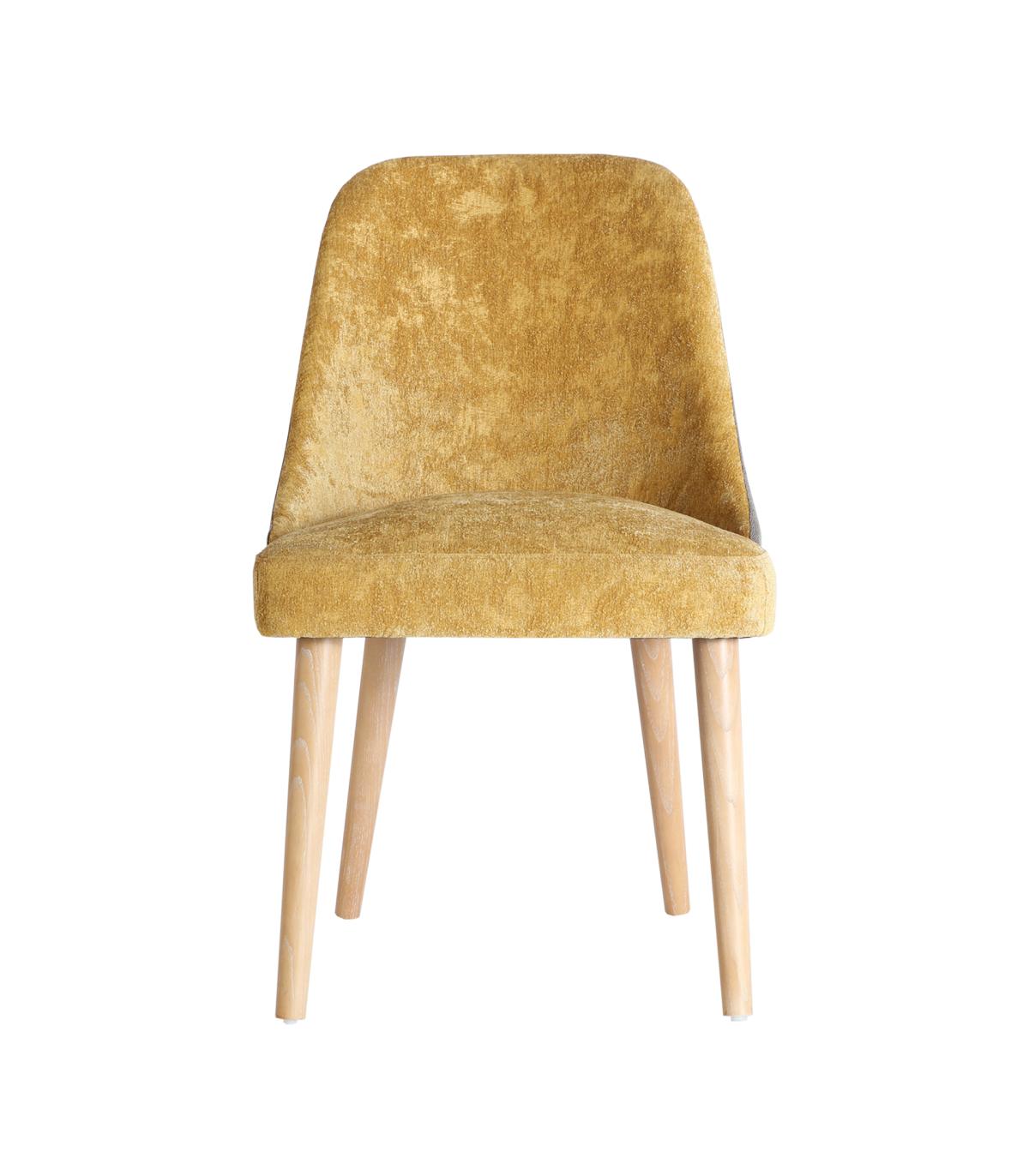 Silla Lage de estilo kitsh fabricado en madera de abeto en color marrón claro combinado con poliéster en color ocre y lino en color tonos neutros. Espuma. Producto desmontable.