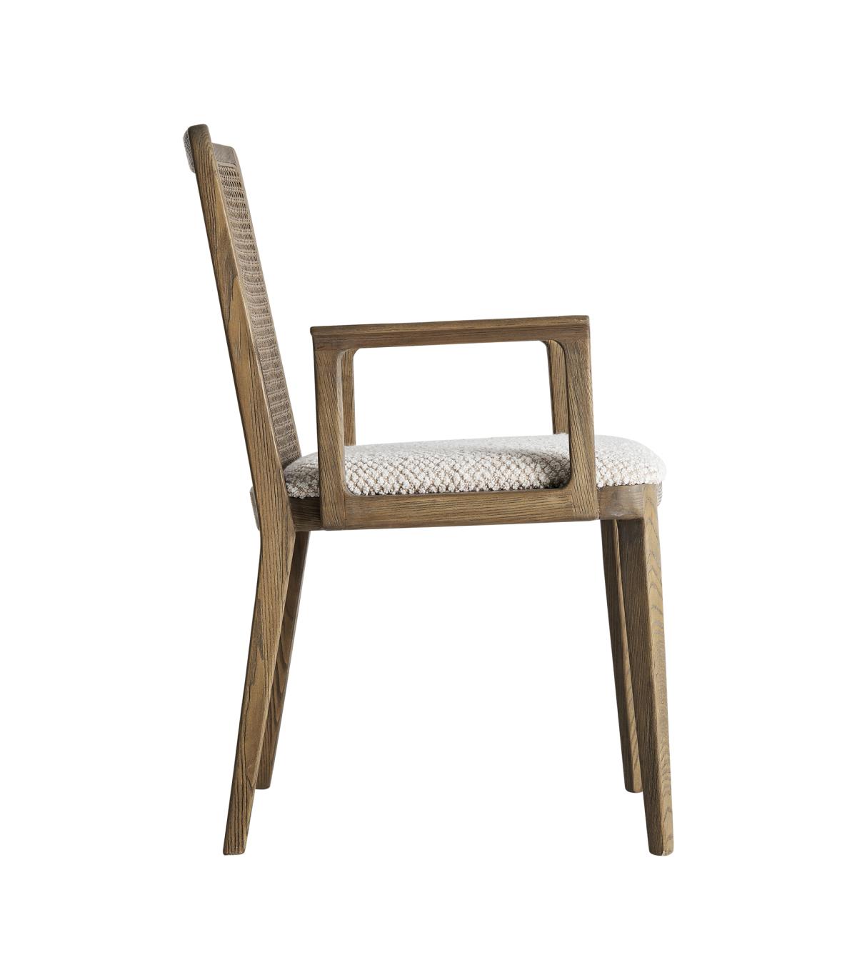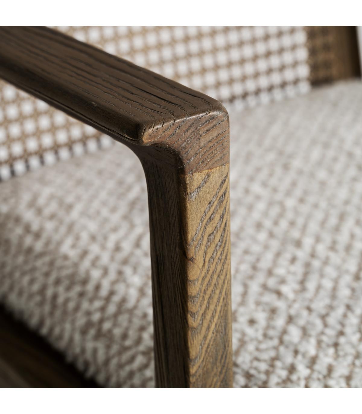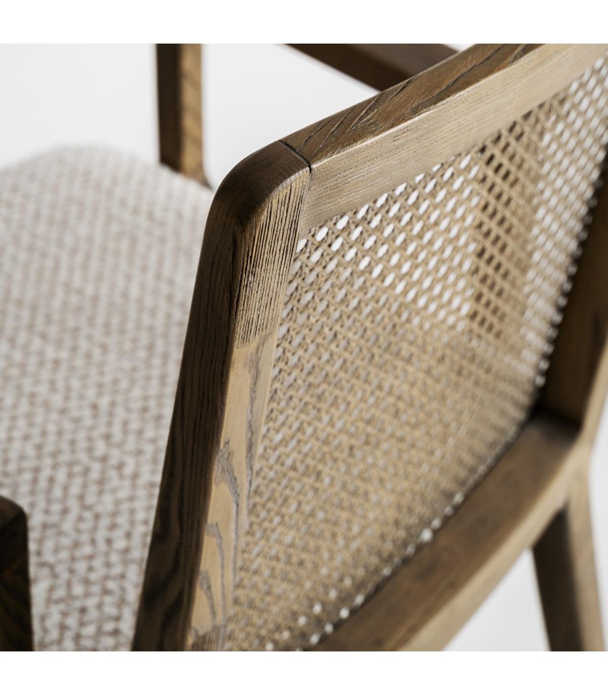Silla fabricado en madera de fresno en color marrón combinado con lino en color beige.