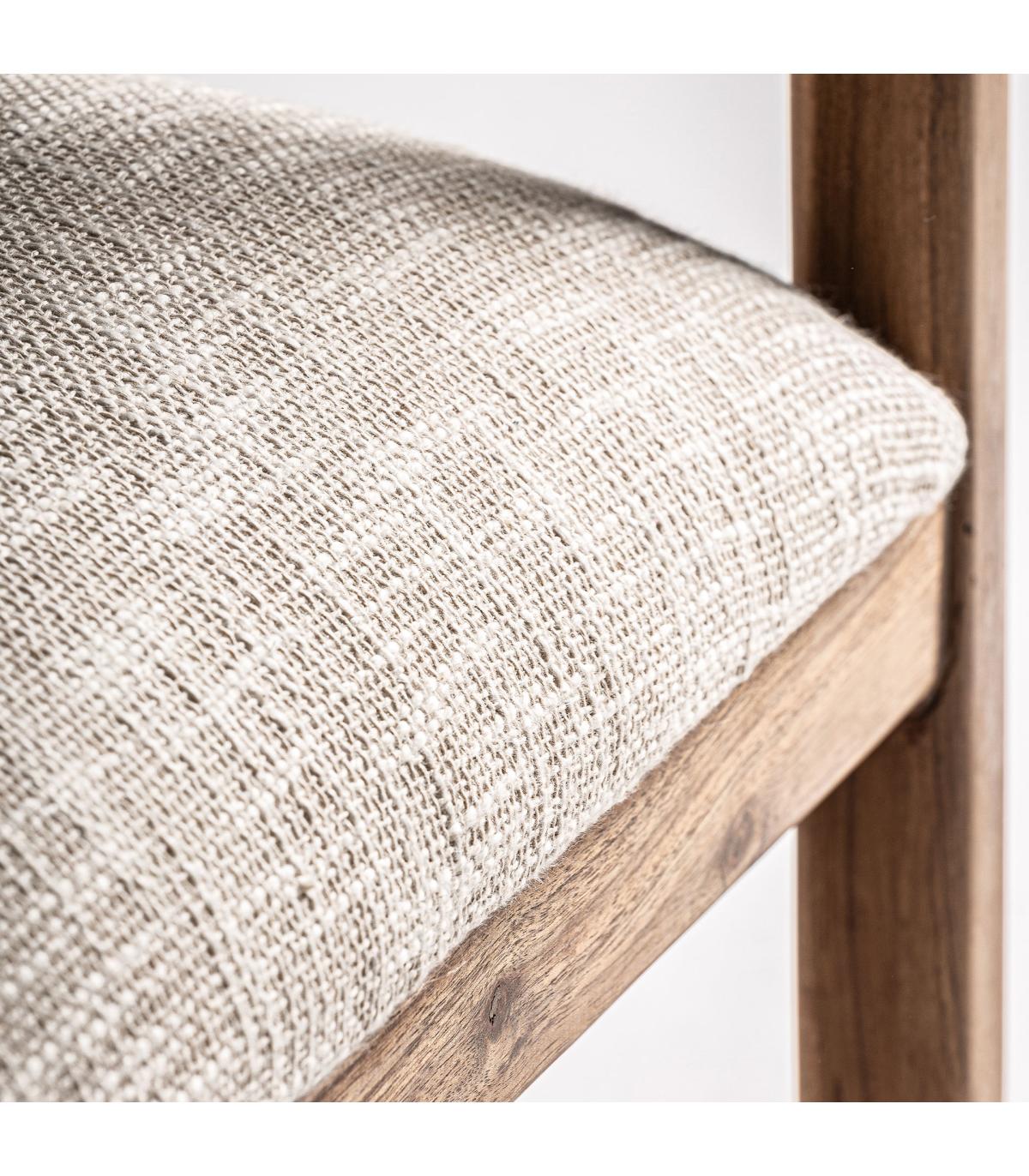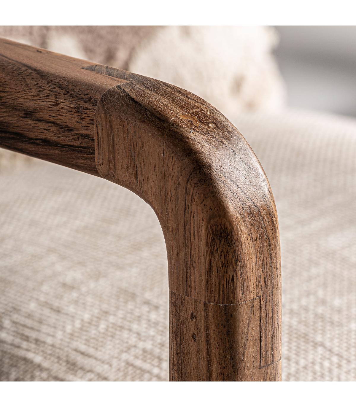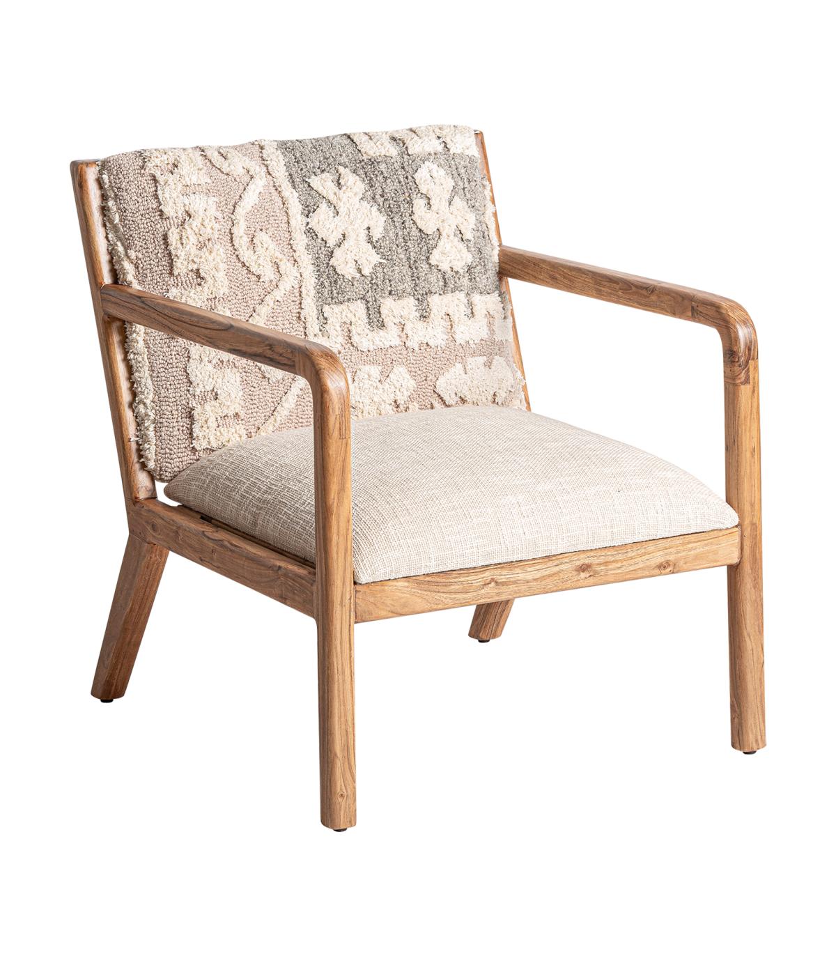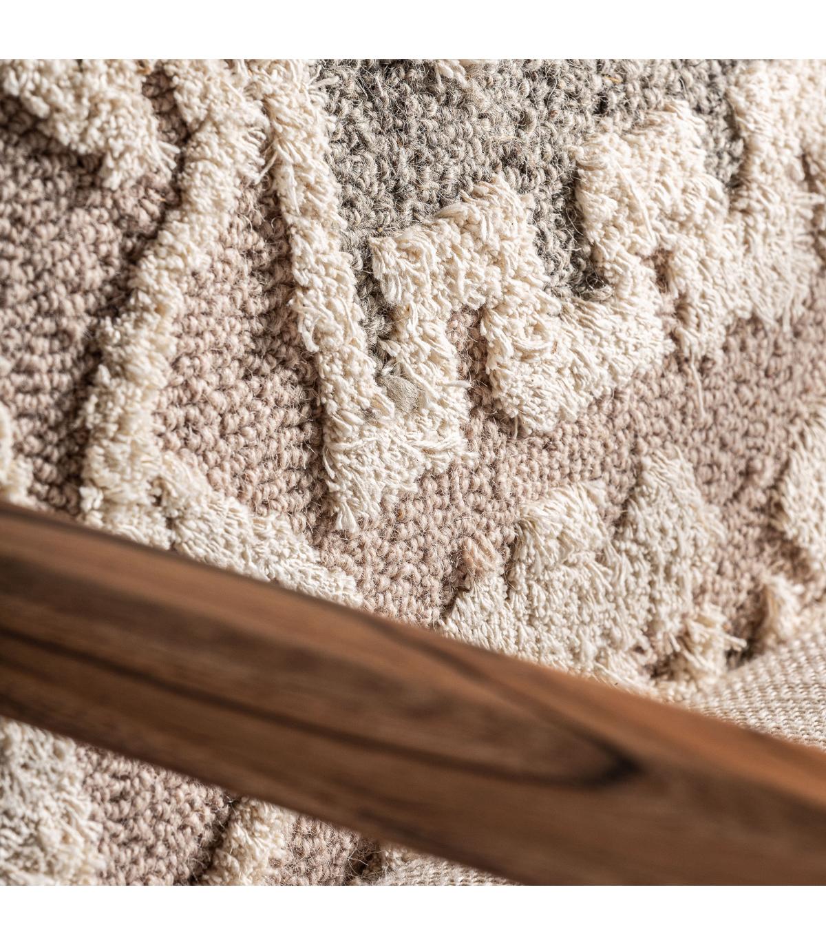 Sillón greensburg de estilo boho fabricado en madera de mango en color marrón claro con acabado natural combinado con algodón en color blanco roto con acabado jaspeado y cáñamo en color marrón con acabado natural.