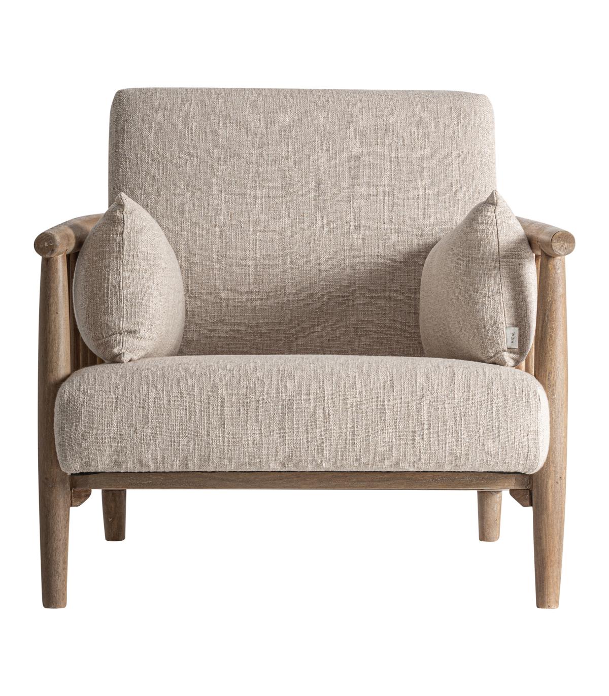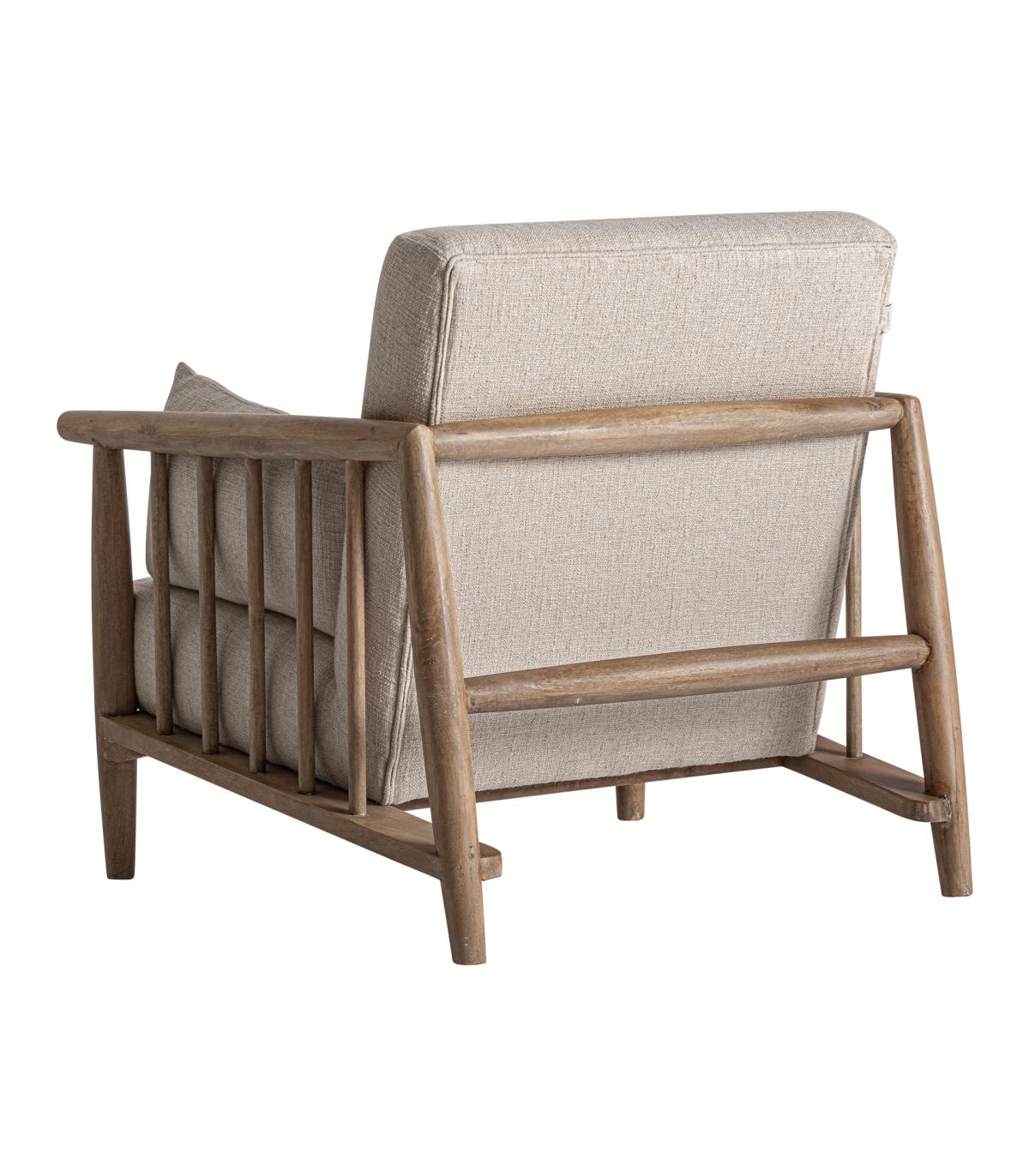 Sillón fabricado en madera abedul en color marrón combinado con algodón en color beige.
