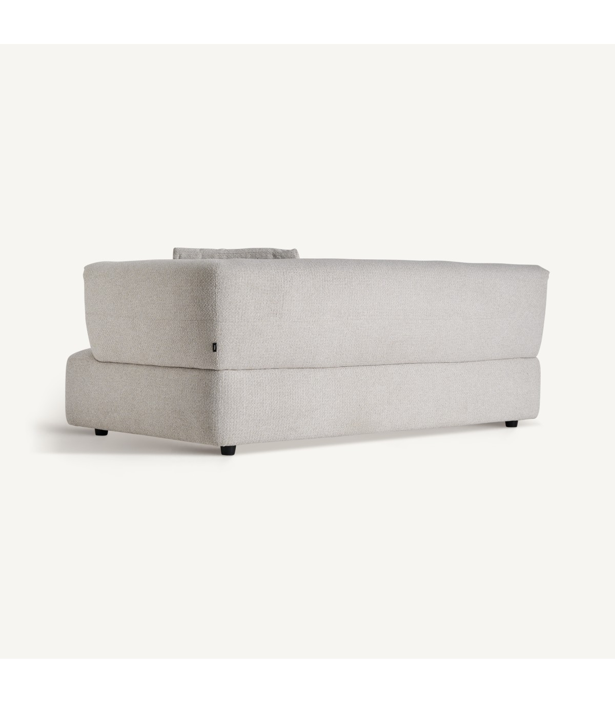 Sofá modular fabricado en poliéster en color blanco roto combinado con madera.
