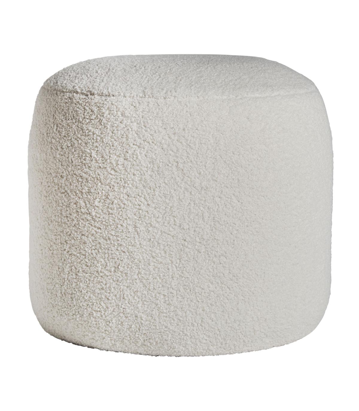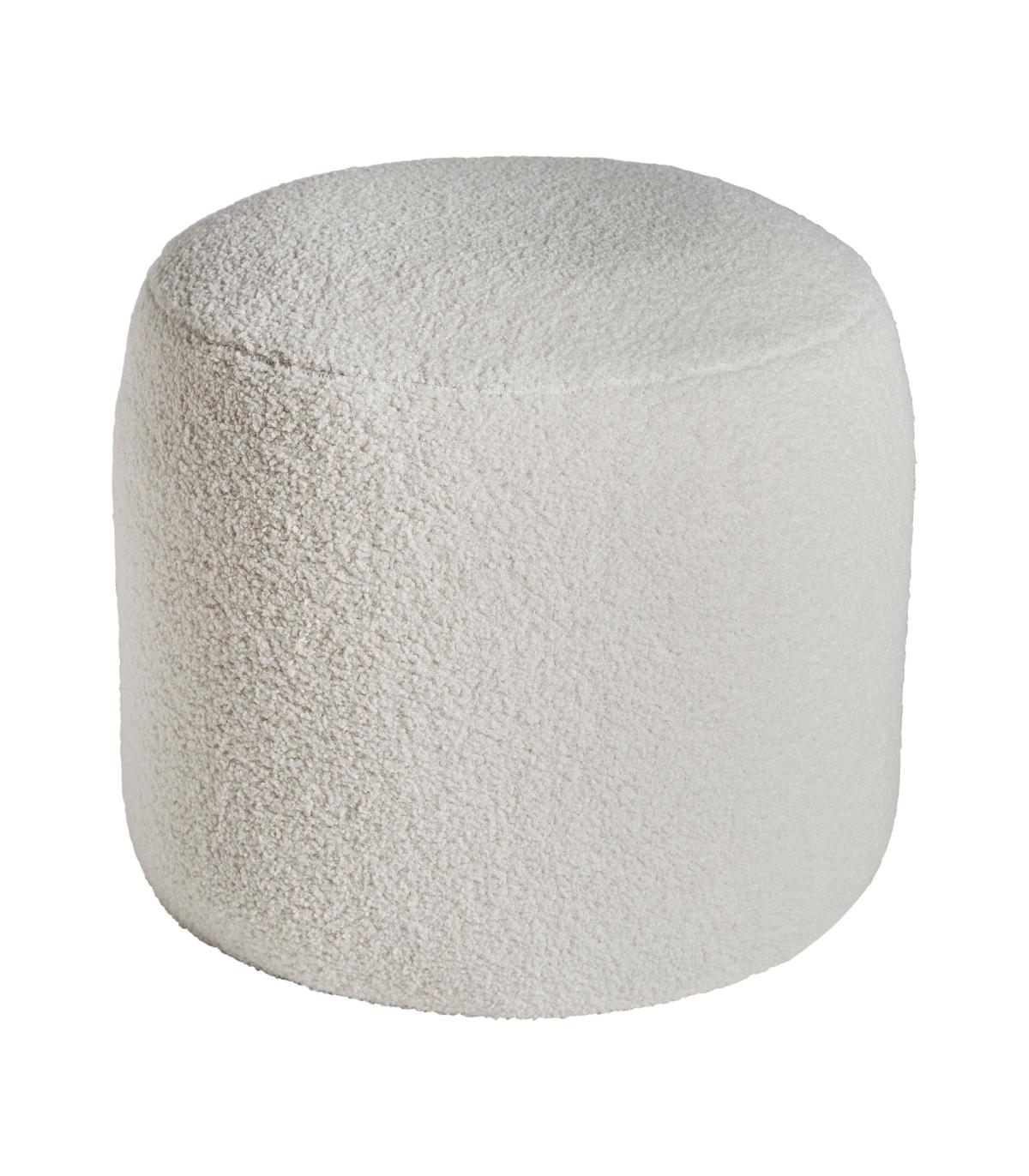 Reposapiés redondo bats de estilo shabby chic, fabricado en algodón bouclé en color blanco, combinado con madera de pino y espuma.