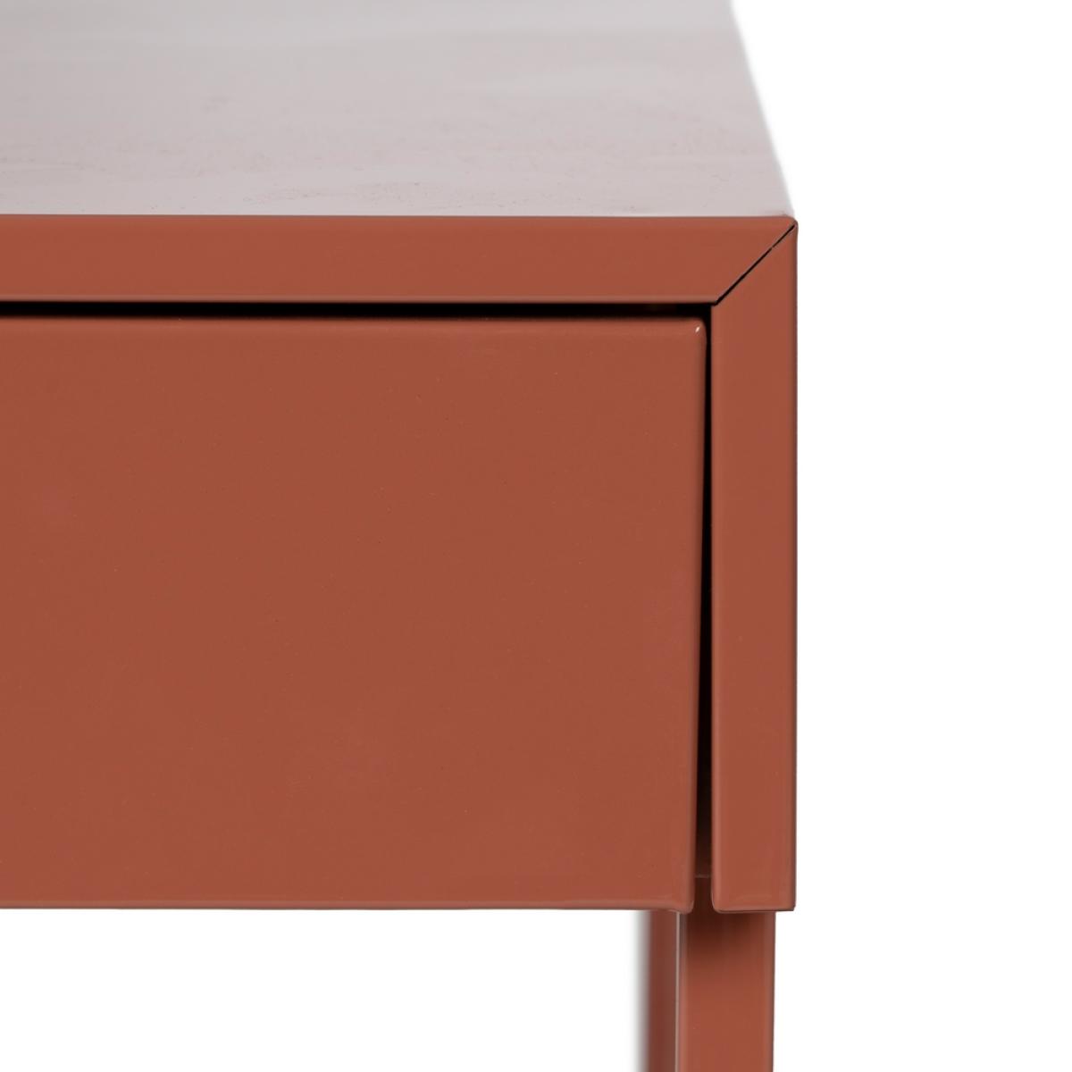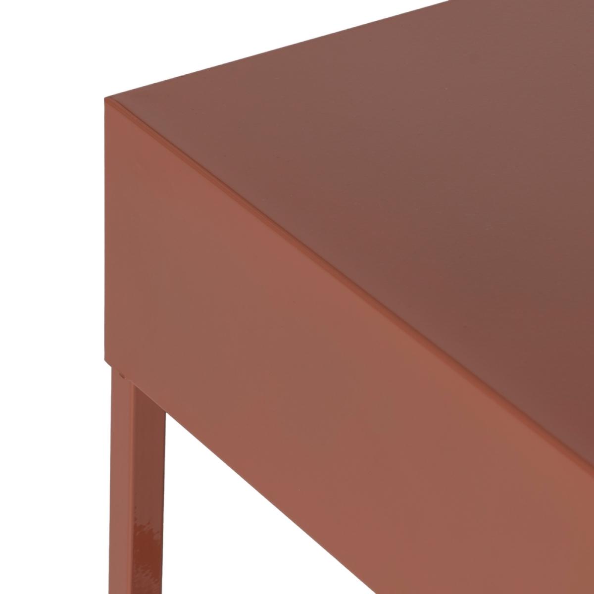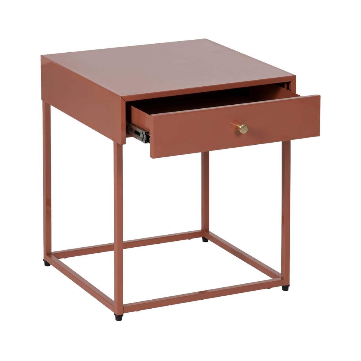 MESITA TERRACOTA ACERO 43 X 41 X 50 CM REQUIERE MONTAJE. Altura patas:39,4cm. Cajón:36,5x35x6cm. Tirador dorado:1,8x1,8cm. Acabado brillo.