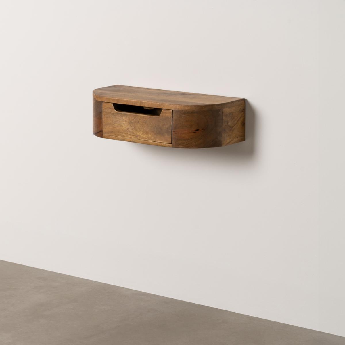 MESITA FLOTANTE MIEL MADERA DE MANGO 50 X 20 X 13 CM Material: madera de mango. Cajón: 27x10cm. Incluye sistema de anclaje.