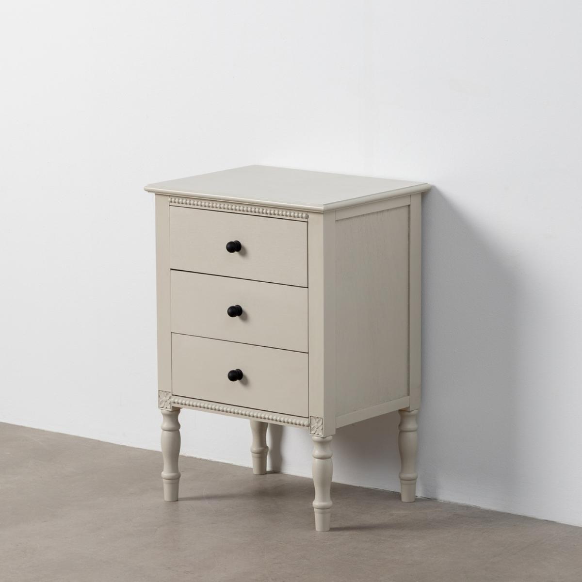 MESITA GRIS CLARO DM 43 X 33 X 61 CM Material: top, cajones Dm - estructura madera de pino. Medida cajones: 33x12cm. Altura patas: 18cm. Patas para montar.